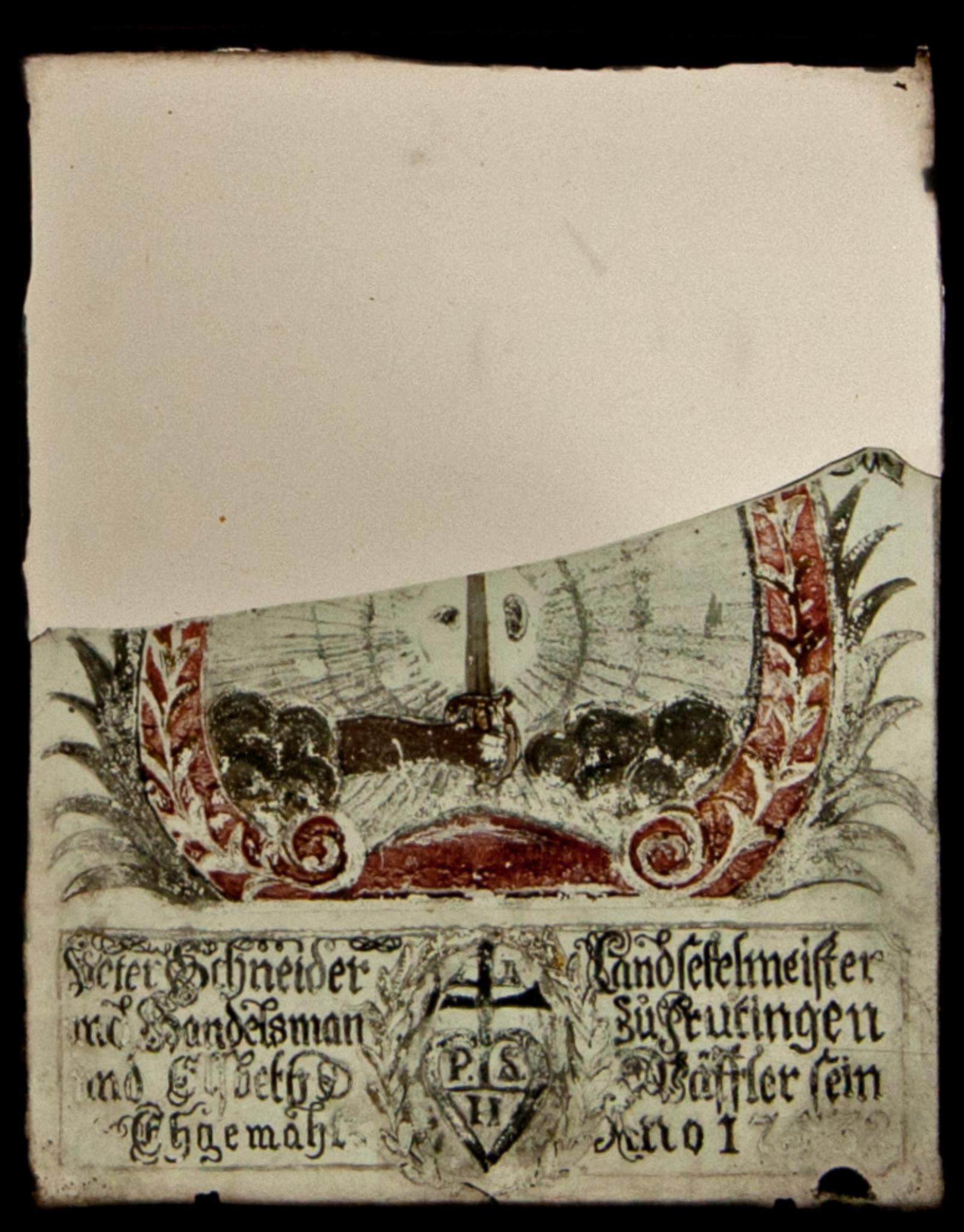 Peter Schnyder (Frutigen 1709–vor 1774), der Sohn des Abraham und der Anna Brügger, war Seckelmeister und Kaufmann. 1735 heiratete er Elisabeth Wäfler (1710–1774), die Tochter des Hans und der Magdalena Trachsel (Frutiger Geschlechter, 2016). Ihre Wappenscheibe ist auf einer alten Fotografie dokumentiert, auf welcher der obere Teil bereits fehlt, die Inschrift hingegen noch besser lesbar ist (Denkmalpflege Bern, Baudokumentation und Archiv).