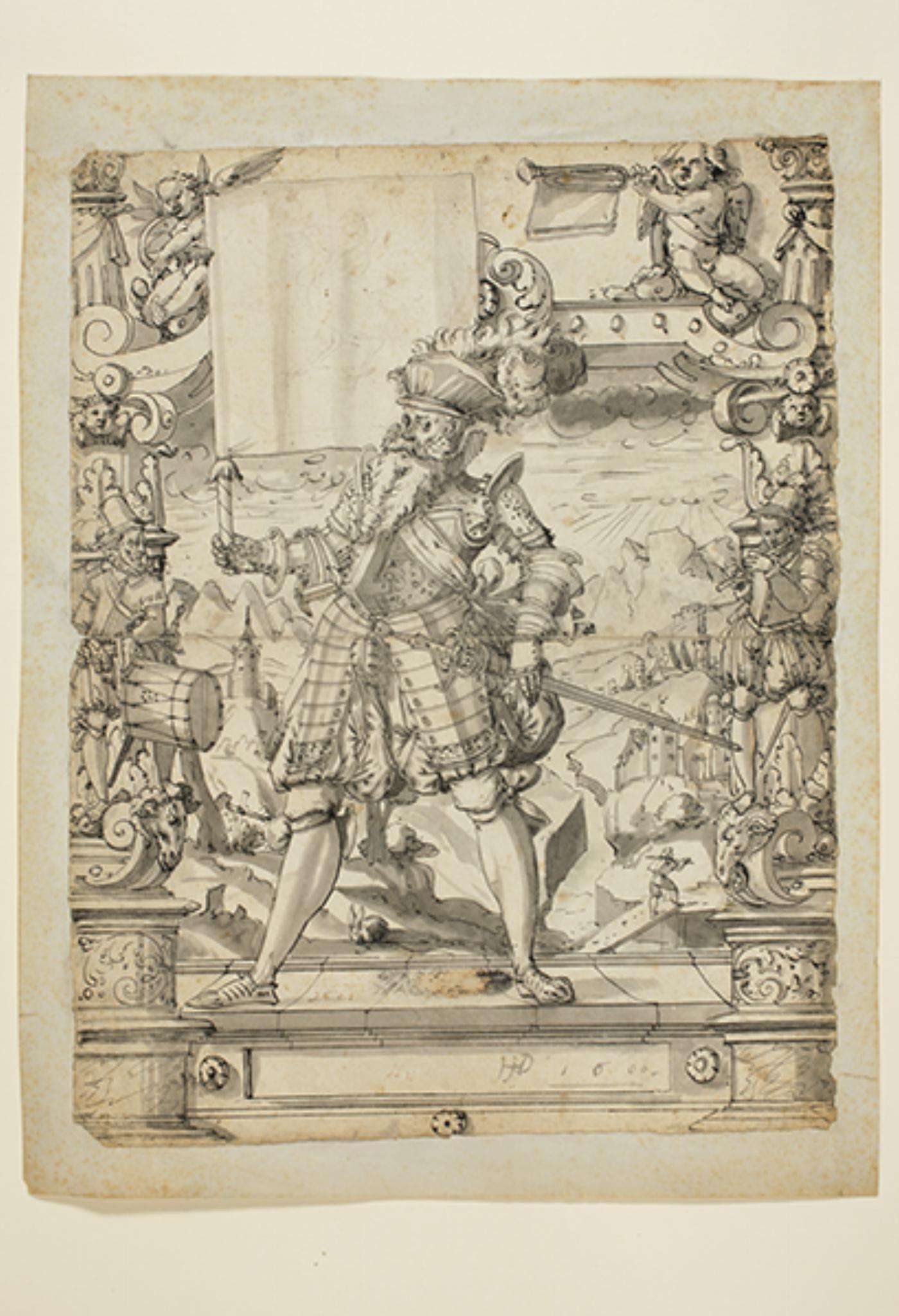 Eine reich geschmückte Pfeilerarchitektur mit einem waagrecht auf Voluten aufliegenden Architrav rahmt die Landschaft. Vor die Pfeiler sind links ein Trommler und rechts ein Pfeifer gesetzt. Das Banner und das Federbarett des Bannerträgers überschneiden die Architektur. Oben auf dem Architrav sitzen zwei musizierende Engel. Unten an der Bühnenfront ist eine Inschriftentafel eingefügt. In diese ist das Künstlermonogramm und die Jahreszahl geschrieben.