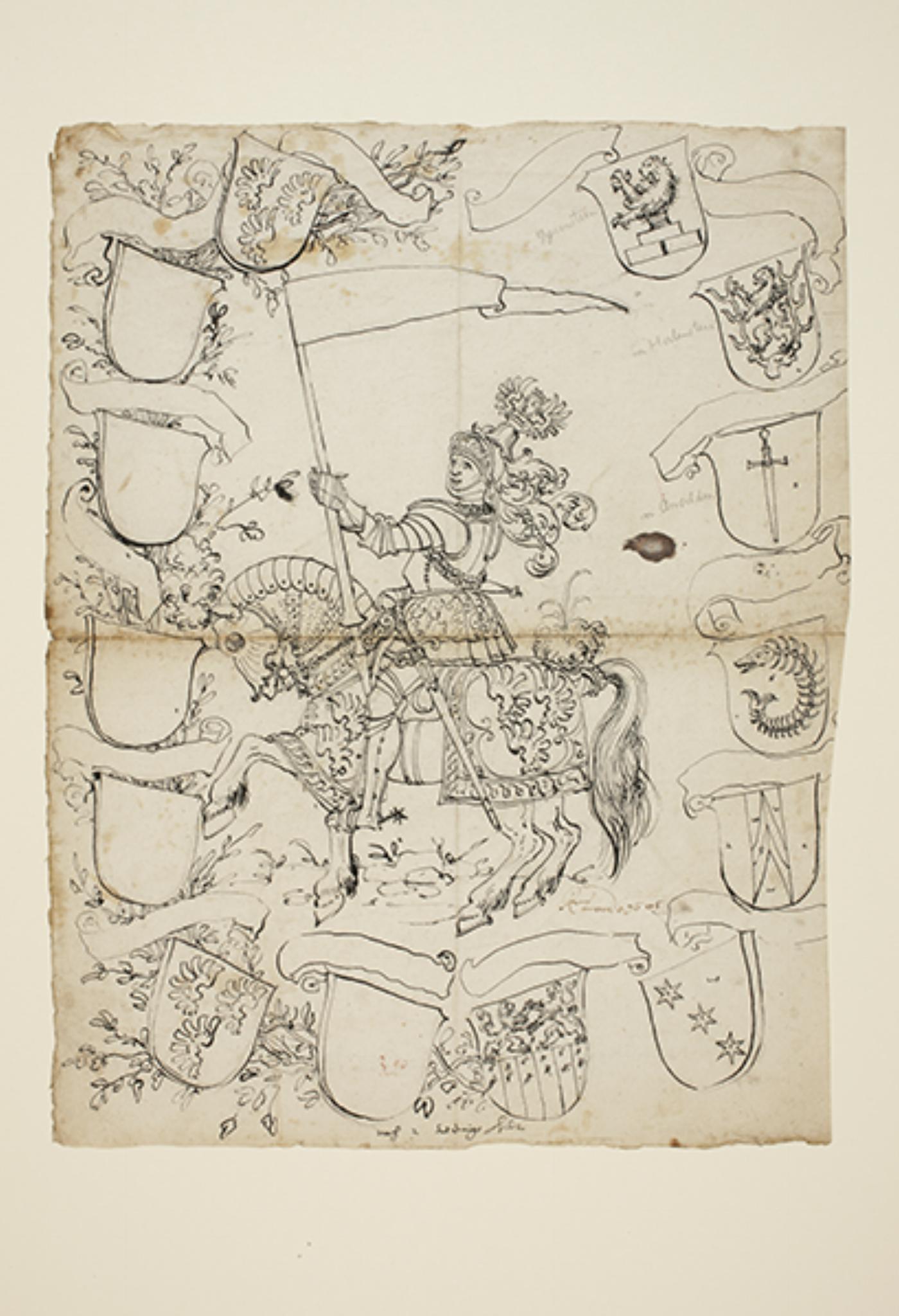 Der Entwurf wird von einem Ritter im Vollharnisch hoch zu Ross dominiert. In der linken Hand hält er eine Flagge, und auf dem Helm ist das Kleinod des von-Wattenwyl-Wappens aufgesetzt. Auch die Decke des Pferdes ist mit dem Wappen der von Wattenwyl geschmückt. Der Ritter auf seinem Ross ist in eine nur andeutungsweise skizzierte Landschaft gesetzt. Er wird eingefasst von einem Kranz aus vierzehn Wappenschilden, die durch einen Pflanzenkranz verbunden sind. Dieser ist allerdings nur auf der linken Blatthälfte ausgeführt. Lediglich neun Schilde sind ausgefüllt und teilweise mit Beschriftungen ergänzt.