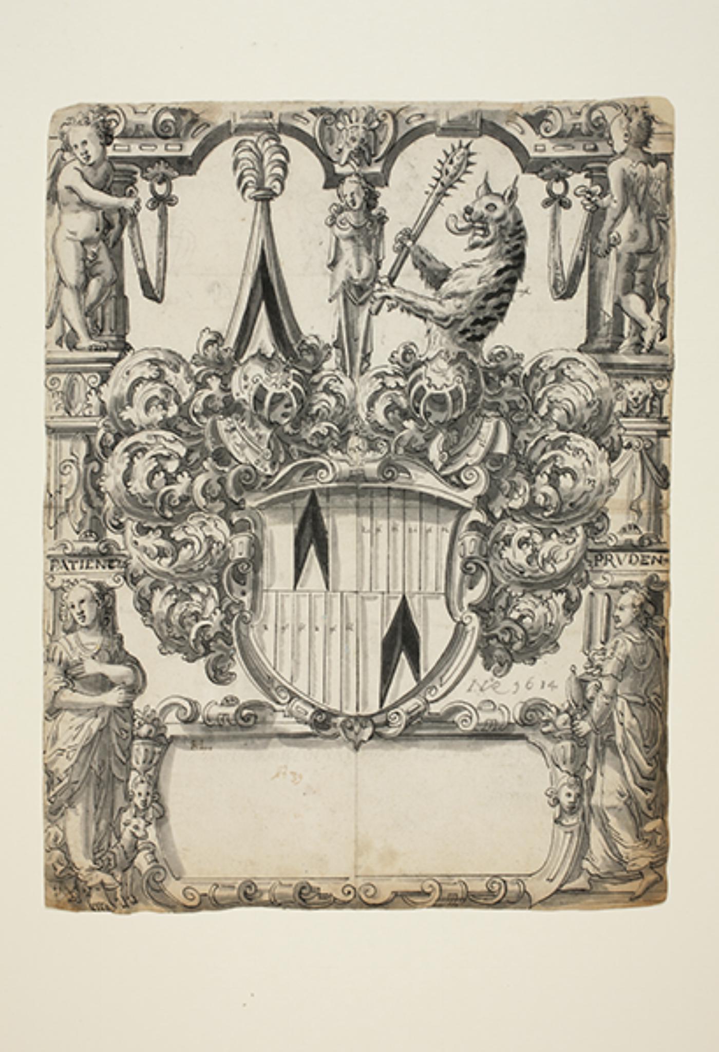 Das zentrale Allianzwappen dominiert den Entwurf. Es wird von einem Doppelbogen gerahmt, dessen mittlere Stütze eine Hermenfigur bildet. Im obersten Teil des Bogens stehen vor den Säulen je zwei Putto, links zum Betrachter blickend und rechts in Rückenansicht. Am Sockel des Rahmens stehen je zwei Tugenden: links Patientia und rechts Prudentia. Zwischen den beiden Figuren ist die leere Inschriftenkartusche eingefügt.
