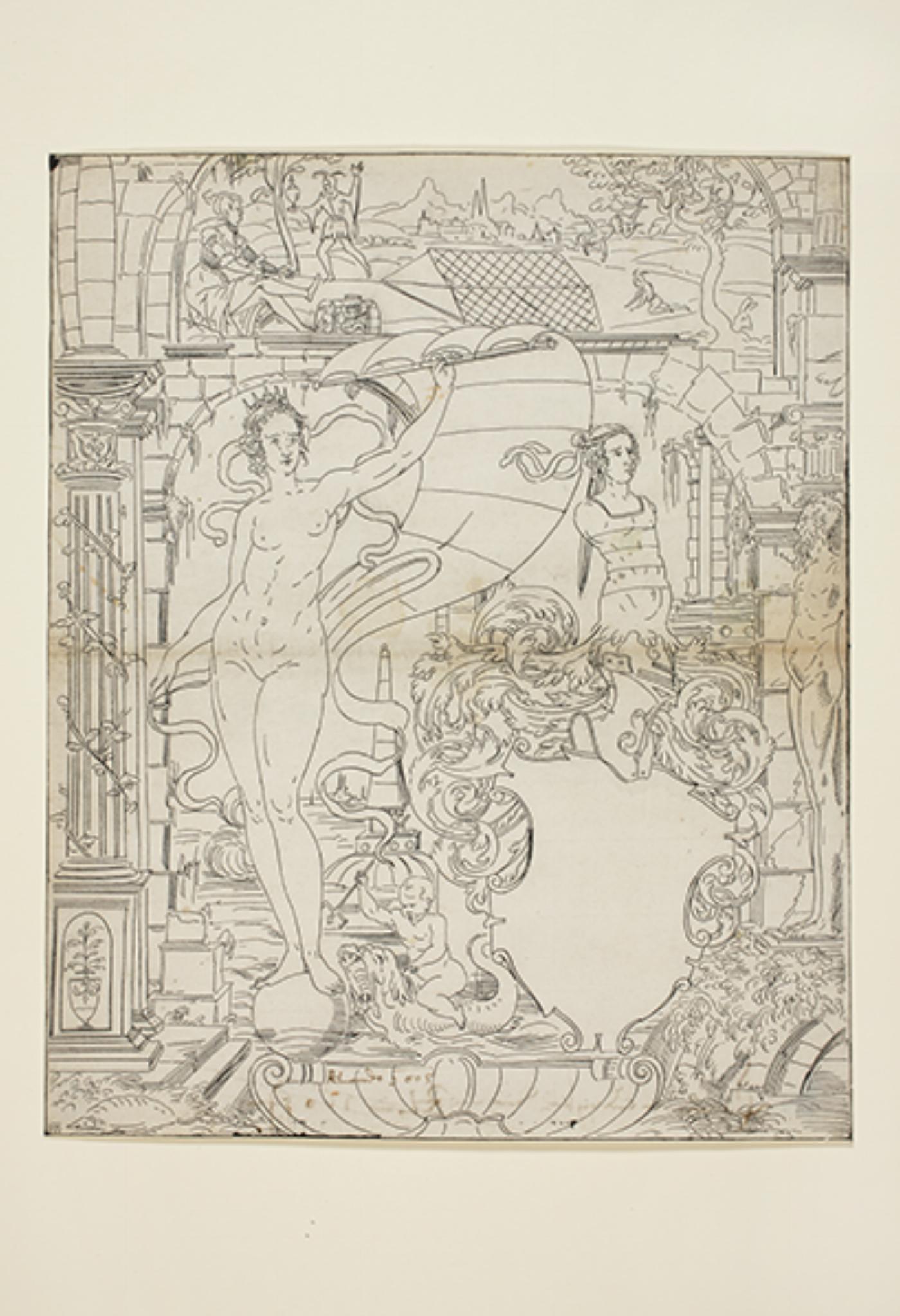 Vor einer antikisierenden Meereslandschaft erscheint links Fortuna, nackt auf einer Kugel stehend und mit geblähtem Segel, und rechts ein leerer Wappenschild. Zwischen den beiden reitet ein Putto mit einem Dreizack in seiner rechten Hand auf einem Triton. Unten schliesst die Zeichnung in der Mitte mit einer Muschel-Kartusche ab. Der bewachsene rustikale Bogen ist links mit einer kompositen Säule und rechts mit einer männlichen Figurenstütze geschmückt. Der linke und rechte Teil der Bogenrahmung sind nicht identisch, dennoch ist die Komposition nicht als Doppelprojektion zu deuten, wie bereits Glaser (1937, S. 56) hervorhob. Im Oberbild ist eine Frau mit einem Stellnetz auf Männer- bzw. Narrenfang dargestellt.
