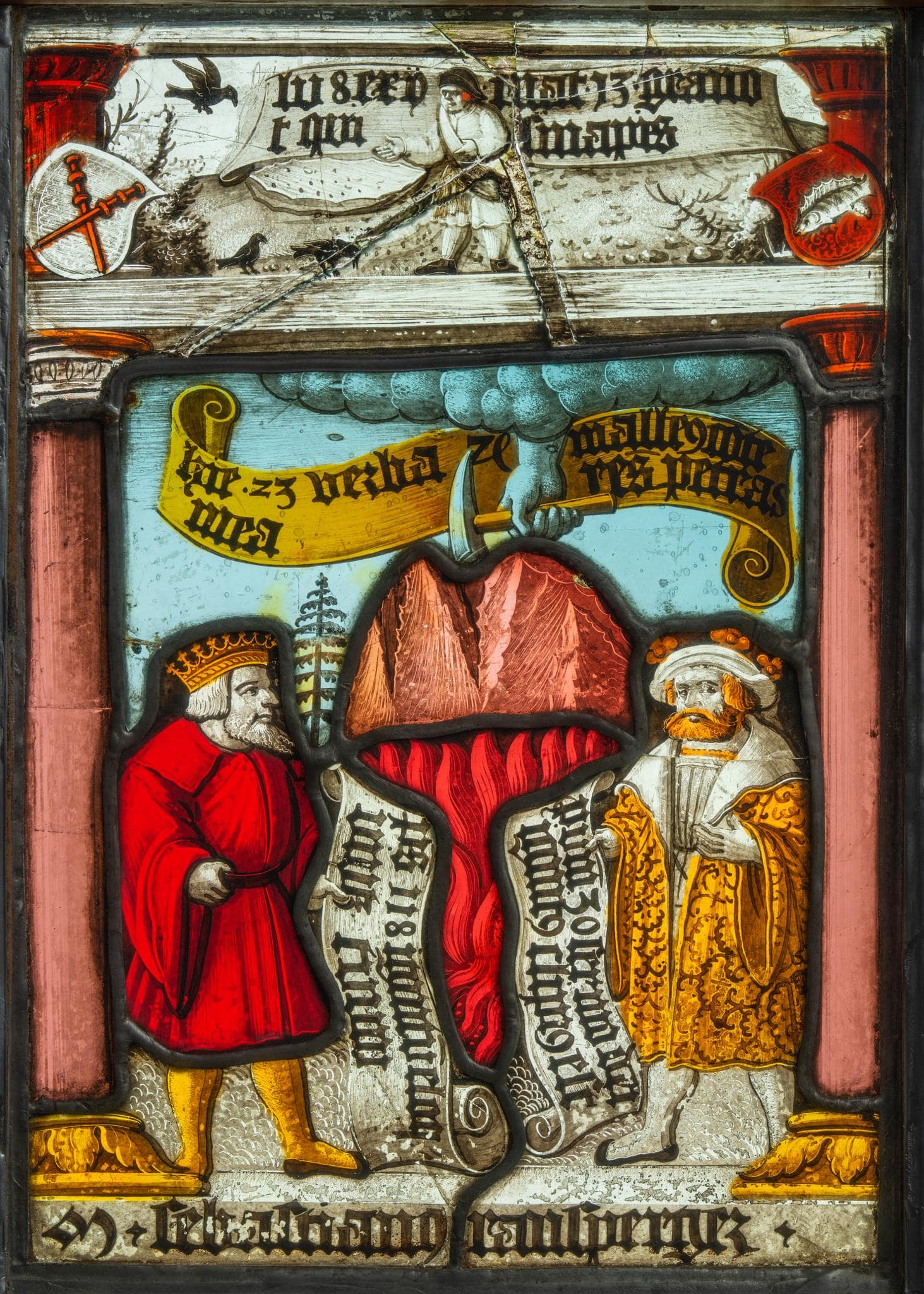 Nach der Aufhebung des Klosters Rüti 1525 war Gossau ZH ein Zentrum der Wiedertäufer. Als Anhänger Zwinglis widmete Pfarrer Ramsperger seine Scheibe dem Wort Gottes, das die Reformierten ins Zentrum ihres Glaubens stellten. Durch Bibelzitate untermauert, erscheint dieses hier in Jeremias’ sinnbildhaften Worten als brennendes Feuer, das wie ein Hammer Felsen zertrümmert. Als Propagandamedium für den Neuen Glauben dienend, gehört Ramspergers Glasgemälde zu den inhaltlich bedeutungsvollsten Werken der Sammlung Reding.