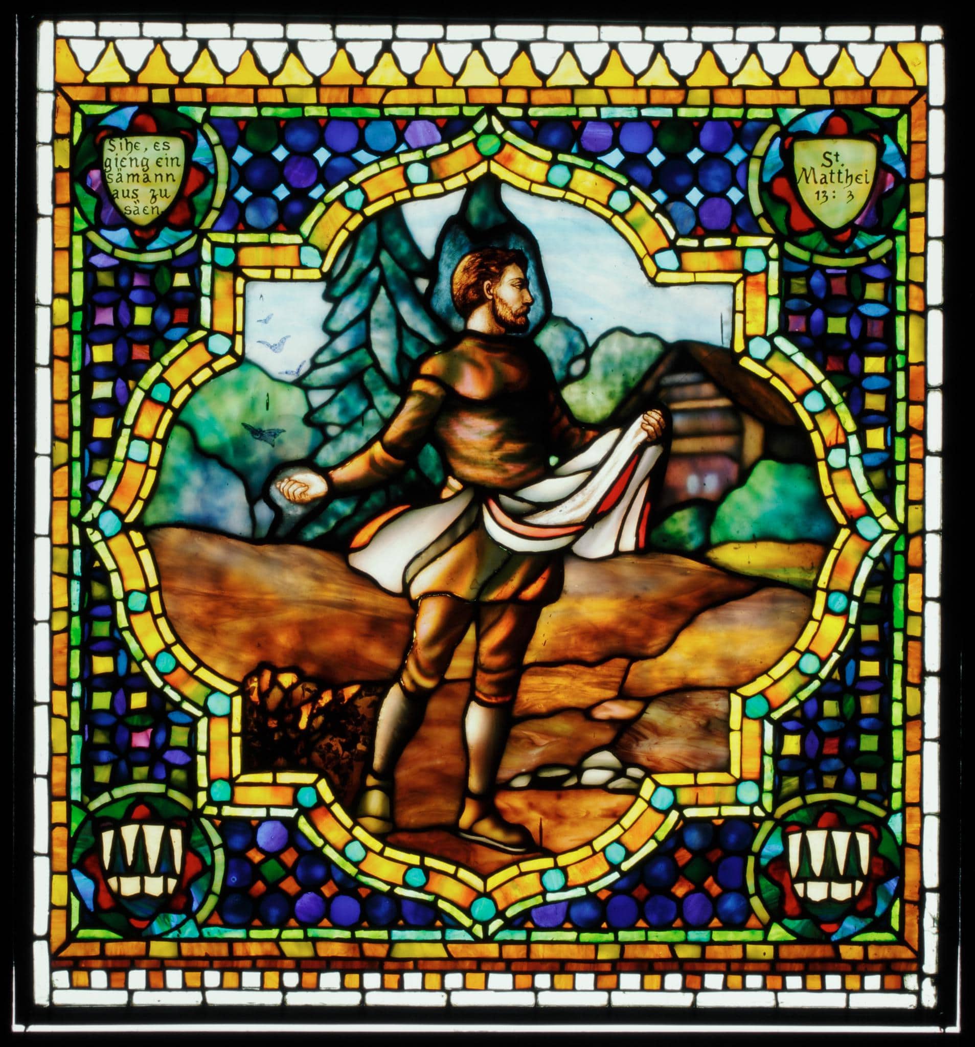 Die Darstellung von Christus’ Gleichnis des Sämannes (Matthäus 13.3) und die Familienwappen (unten) erlauben Bezüge zu Holzers Vorfahren herzustellen, die seit Generationen als Bauern in Moosseedorf tätig waren. Holzers Selbstbildnis unterstreicht den memorativen Charakter des Werks. Aufbau und Ikonographie der an eidgenössische Wappenscheiben erinnernden Glasmalerei folgen Bildvorlagen aus dem 16. und 17. Jahrhundert.