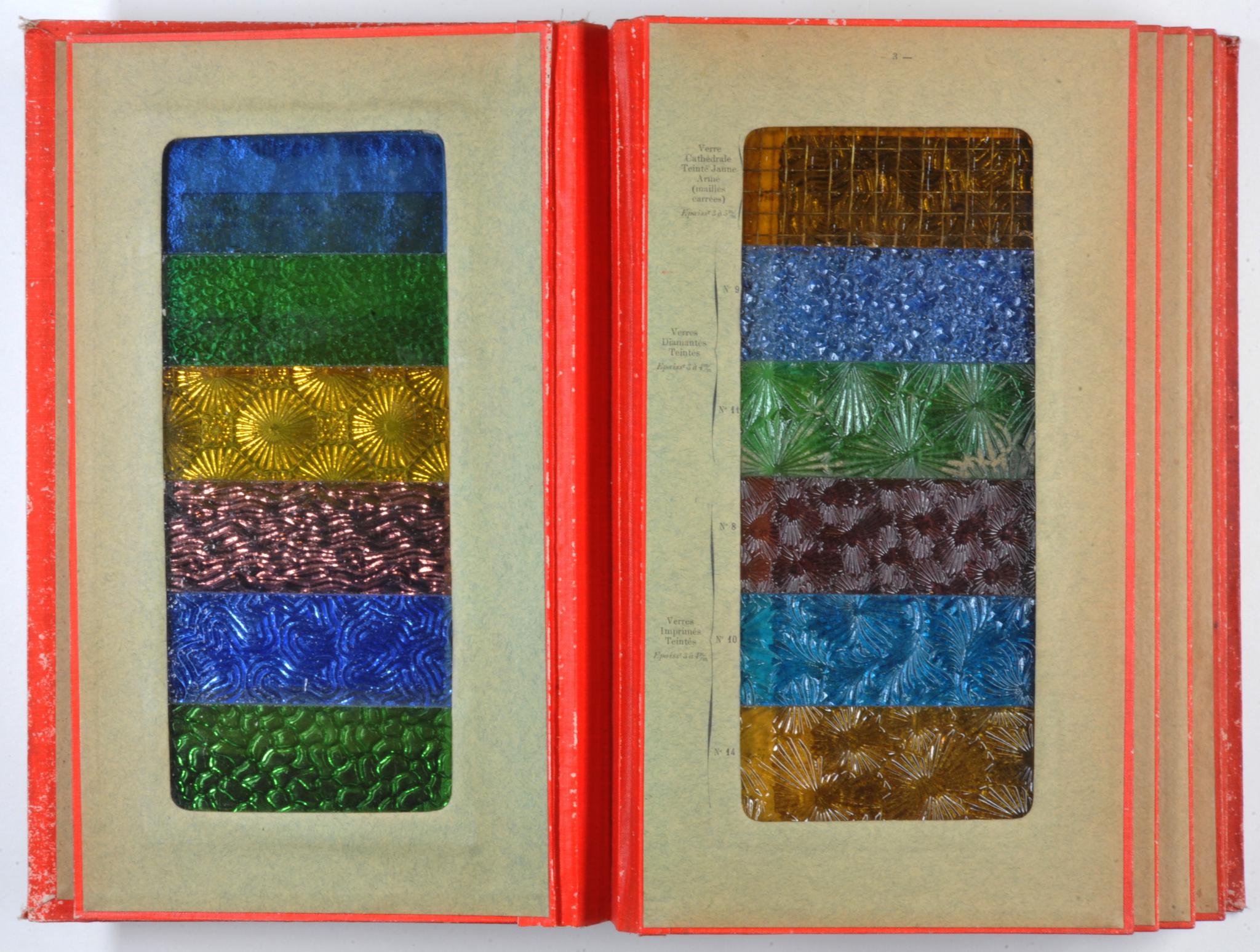 Livre d’échantillons de verres spéciaux. Les pages de couverture sont recouvertes d’un tissu rouge sur lequel le titre est imprimé en lettres dorées. L’album comporte douze feuillets non paginés présentant chacun environ six échantillons de verres. Les échantillons sont généralement numérotés et commentés dans la marge en papier qui entoure et maintient les verres (type de verre, épaisseur, etc).