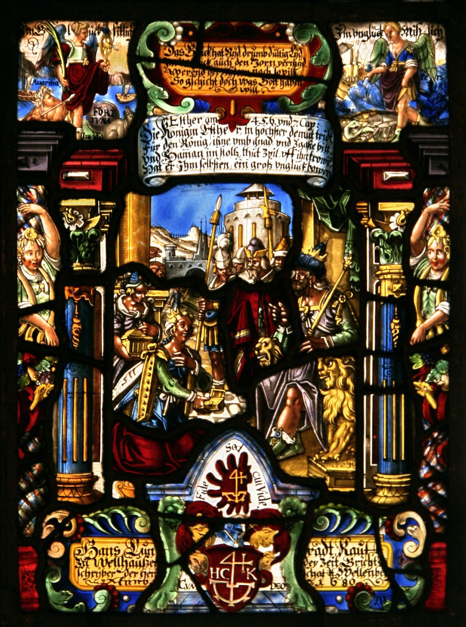 In der Bildmitte kniet Esther vor dem auf dem Löwenthron sitzenden König Ahasver, um Fürsprache für die Juden einzulegen (Est 5, 1–4). Neben ihr steht eine weitere Bittstellerin, neben dem König halten Soldaten Wache. Im Hintergrund ist eine Stadt zu erblicken. Je ein Pfeiler mit vorgesetzter blauer Halbsäule sowie eine Spiralsäule mit Karyatide begrenzen die Szene seitlich. Am unteren Rand ist das Vollwappen des Stifters vor die Inschriftenkartusche mit dessen Namen gesetzt. Über dem mit einer Schriftrolle belegten Gebälk ist eine weitere Kartusche mit einem Spruch angebracht. Links davon erscheint die Fortuna mit Flügeln und dem Schicksalsrad in der Hand. Sie steht vor ruhigem Meer und zu ihren Füssen befinden sich als Allegorien für Geiz und Neid ein Mann mit Speer sowie ein Hund. Auf der Gegenseite ist ebenfalls eine geflügelte Frauenfigur dargestellt, diesmal vor stürmischem Meer. Von zwei Seeungeheuern sowie einer Teufelsgestalt (Stolz und Verfolgung) begleitet, symbolisiert sie das Unglück.