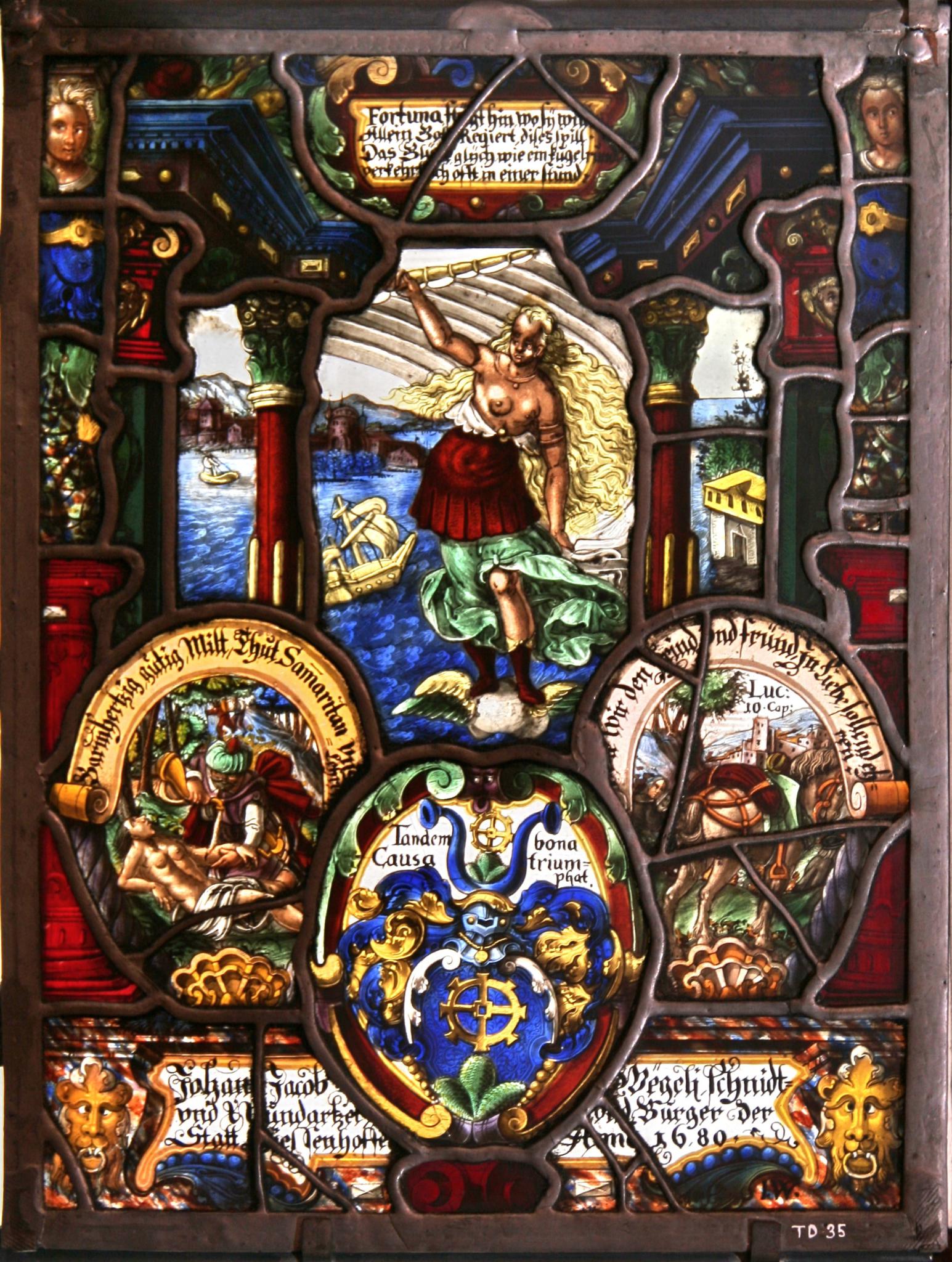 Unten in der Mitte ist vor dem beschrifteten, von Löwenmasken flankierten Podium das oval umkränzte Vollwappen des Stifters festgehalten. Daran schliesst sich zu beiden Seiten ein weiteres, oben von einer Schriftrolle umfasstes ovales Bildfeld an, worin in Beziehung zum Beruf des Stifters eine Szene aus der Geschichte des Barmherzigen Samariters erscheint. Sie zeigt, wie dieser den überfallenen und entkleideten Mann im Wald versorgt, den er auf seinem im gegenüberliegenden Feld dargestellten Pferd zur Herberge führen wird (Lk 10, 29–37). Das zwischen die rahmende, dreiachsige Säulenarchitektur gesetzte Hauptbild ist der Fortuna, der Göttin des Glücks, gewidmet. Mit entblösstem Oberkörper in einer Meereslandschaft auf einer geflügelten Kugel über das Wasser gleitend, hält sie ein aufgeblähtes Segel in ihren Händen. Im Gebälk darüber ist in einer Kartusche die darauf bezügliche Bildlegende angebracht. Die äusseren Rahmenstützen sind im oberen Teil mit Karyatiden verziert.