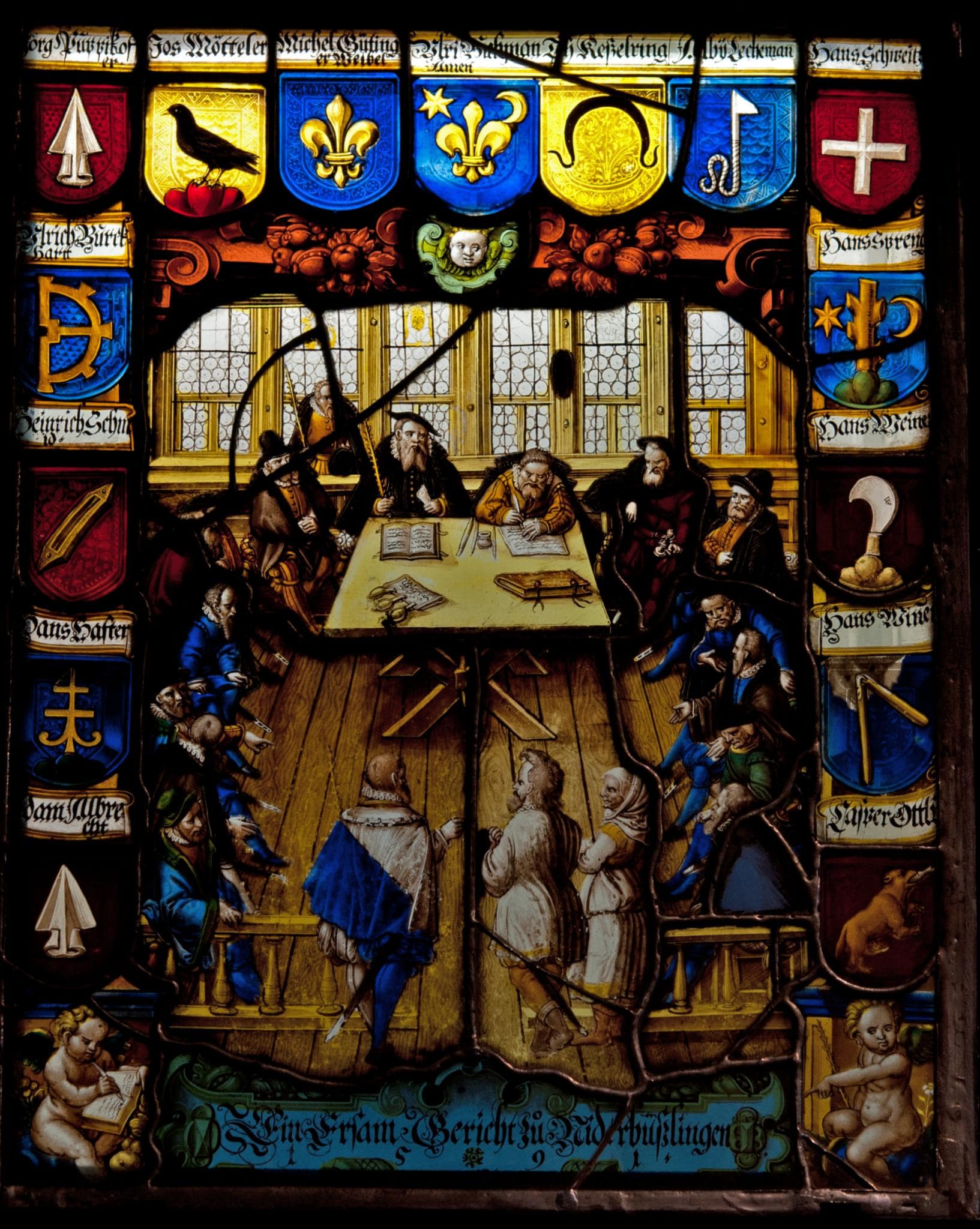 Einige neue Ergänzungen in der Wappenreihe; zahlreiche Sprünge und einige Sprungbleie; die Verbleiung erneuert.