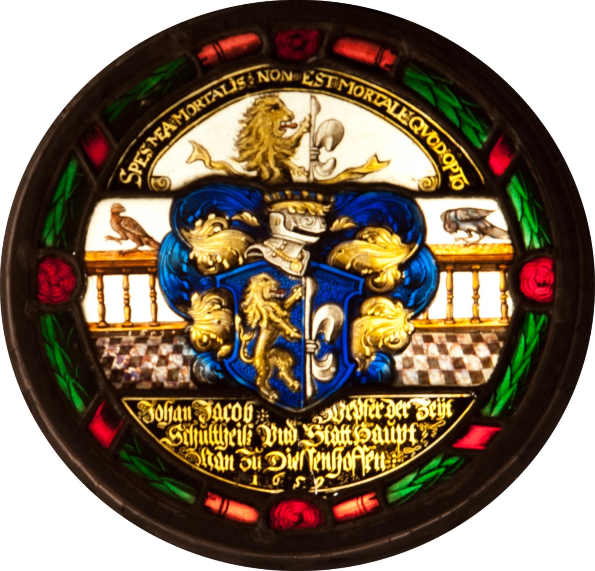 Seit 1460 besass die Stadt Diessenhofen die hohe und von 1489–1798 auch die niedere Gerichtsbarkeit über das 3 Kilometer nordwestlich von ihr gelegene Schlattingen, das seit 1999 zur politischen Gemeinde Basadingen gehört. Bald nach der Reformation wurden die Schlattinger nach Stammheim pfarrgenössig und blieben dies bis 1827. Es waren aber Pfarrhelfer aus Diessenhofen, die ab 1585 in der Kirche Schlattingen Predigt hielten (Historisches Lexikon der Schweiz, 11/2012, S. 102f.). Um die Mitte des 17. Jahrhunderts fanden in der reformierten Kirche Schlattingens umfangreichere Renovationen statt. Die Scheiben von 1657 und 1659 dürften anlässlich von deren Abschluss dorthin gelangt sein. So erhielten damals die Schlattinger von ihrer Gerichtsherrin, der Stadt Diessenhofen sowie von deren Schultheissen und Spendmeister Wappengaben in ihre erneuerte Kirche.
