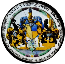 Die Rundscheibe ist gleich komponiert wie die Rundscheibe des Cornelius Zollikofer von 1636 (TG_189), ausser dass auf letzterer drei statt zwei Wappen dargestellt sind. Bei vorliegender Scheibe verdeckt das Randblei die Jahreszahl, sodass sie 1630 datiert wurde. Beide Scheiben wurden aber wahrscheinlich 1636 an denselben unbekannten Ort gestiftet.