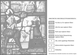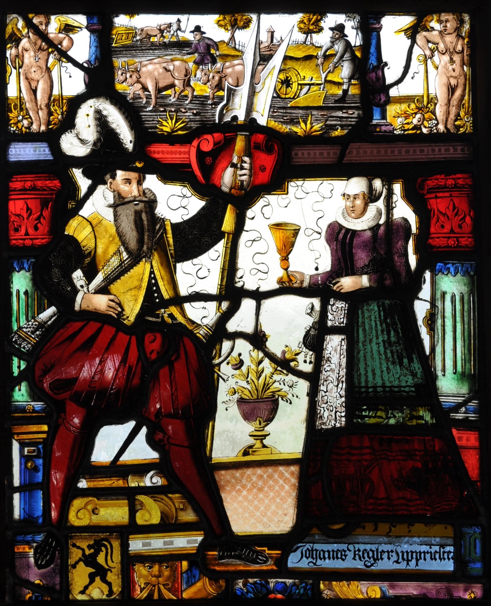 Die zahlreiche Flickstücke besitzende Willkommscheibe zeigt das Stifterpaar vor farblosem, schnurverziertem Grund. Der langbärtige, die Halbarte in seiner linken Hand haltende Mann erscheint in roten Beinkleidern, schwarzem Hemd und Federbarett sowie einem gelben Wams, um das er eine Schärpe gebunden hat. Seine ihm den Pokal mit dem Willkommtrunk anbietende Gemahlin trägt ein violettes Mieder, einen langen zweifarbigen Rock, eine weisse Schürze und eine weisse Haube. Als Originalteile dieser Willkommscheibe anzusprechen sind ebenfalls die Blumenvase zwischen beiden Figuren, die kannelierten hellgrünen Rahmenpfeiler mit ihren roten Kapitellen, das zentrale rote Gebälkstück mit der Hand des Stifters sowie der darüber befindliche Oberbildteil mit der Darstellung zweier das Feld mit einem Ochsengespann pflügender Bauern. Die Gläser in den oberen Bildecken mit den beiden ein Feston mit Fruchtbouquets haltenden Putten sind hingegen alte Flickstücke. Aus solchen Flickstücken zusammengesetzt (das eine davon mit Wappen und ein anderes mit Inschriftenfragment) ist die ganze Fusszone.