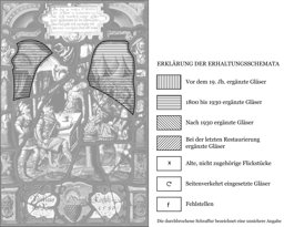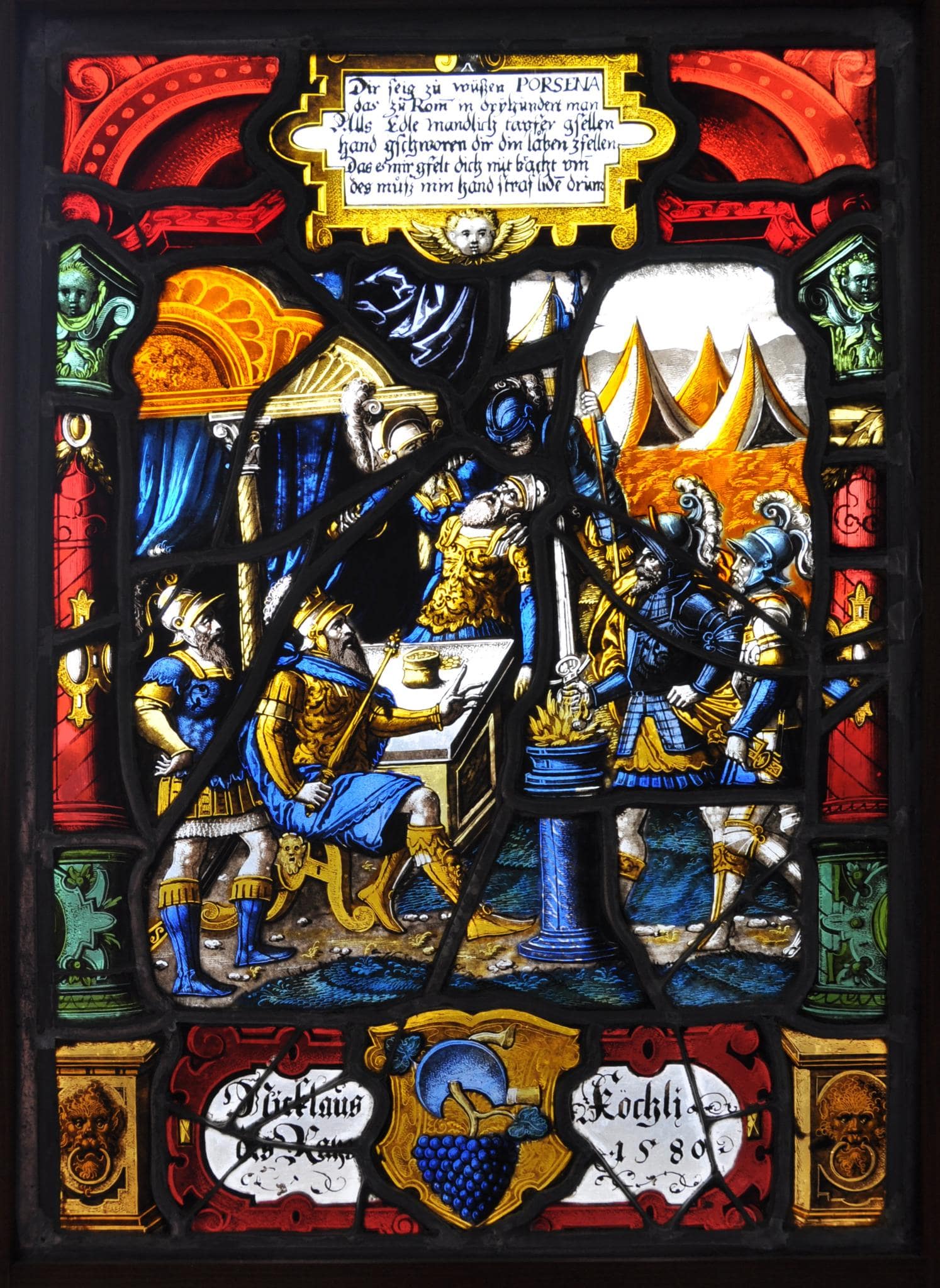 Das Mittelbild schildert die von verschiedenen römischen Historiographen überlieferte Geschichte des Römerhelden Mucius Scaevola. Während der Belagerung Roms durch den etruskischen König Porsenna schlich sich Gaius Mucius als Etrusker verkleidet ins feindliche Lager ein, um Porsenna zu töten. Von den beiden dort vor dem königlichen Zelt im Beisein von Soldaten vorgefundenen, prächtig gekleideten Männern erdolchte er irrtümlicherweise jedoch nicht Porsenna, sondern dessen Schreiber, der beim Verteilen des Soldes war. Nach seinem misslungenen Anschlag gefangen gesetzt, wurde er von Porsenna mit dem Tode durch Verbrennen bedroht, falls er nicht die Pläne der Römer verrate. Mucius jedoch weigerte sich und als Probe seines Mutes verbrannte er seine rechte Hand im Feuer eines Opferaltars. Die Darstellung zeigt ihn bei seiner Heldentat vor den entsetzten Blicken des vor ihm sitzenden Königs, hinter dessen Tisch ein Soldat den erdolchten Schreiber in den Händen hält. Porsenna war dadurch dermassen beeindruckt, dass er Mucius frei liess und mit den Römern Frieden schloss. Nach seiner Rückkehr in die Stadt erhielt dieser wegen des Verlustes seiner Rechten den Beinamen Scaevola (Linkshand). Das Figurenbild umschliesst eine Renaissance-Rahmung aus roten Säulen, auf deren grünen, mit einem geflügelten Engelskopf geschmückten Kapitellen ein roter Flachbogen mit gelber, die Bildlegende enthaltender Scheitelkartusche ruht. Diese ziert ebenfalls ein geflügelter Engelskopf. Die durch das Stifterwappen unterteilte rote Rollwerkkartusche mit dem Namen Niklaus Koechlis befindet sich am Scheibenfuss zwischen den mit Löwenmasken dekorierten gelben Säulenpostamenten.