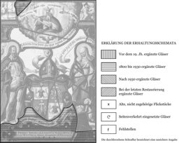 Die Inschrift sowie zwei weitere Stücke neu ergänzt; Sprungbleie; die Verbleiung erneuert.