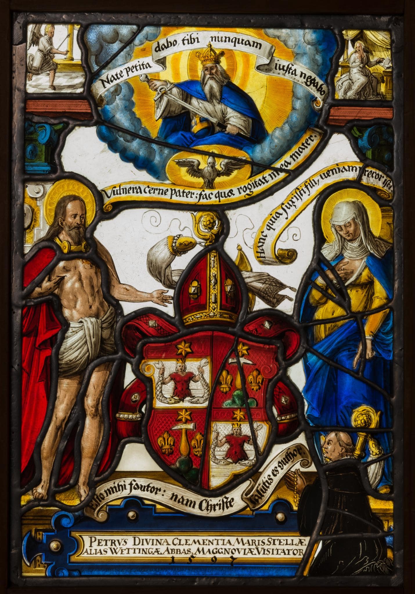 Wappenscheibe Peter Schmid, Abt Zisterzienserkloster Wettingen, mit Interzession Mariae und Christi vor Gottvater