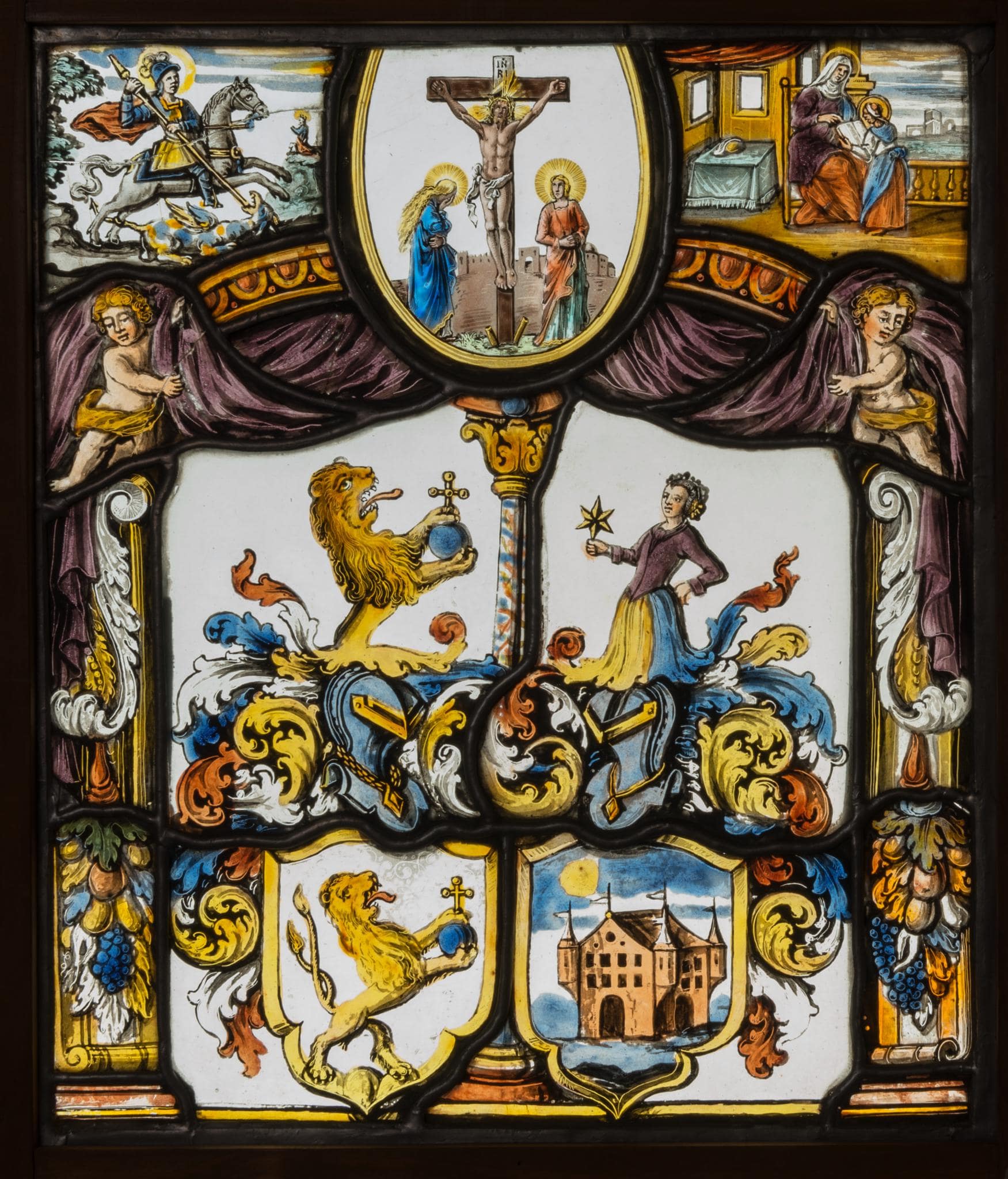 Vor farblosem Grund und einer marmorierten Mittelsäule sind zwei unbekannte Vollwappen dargestellt. Die Rahmung bilden mit Blattwerk geschmückte Pfeiler und ein Flachbogen. Der an diesem befestigte violette Vorhang wird von zwei auf den Pfeilern knienden Putten über den Wappenschilden emporgehoben. In den oberen Eckfeldern erscheinen links der hl. Georg zu Pferd als Drachenbezwinger sowie rechts die vor der Stube sitzende hl. Anna mit der in einem Buch lesenden Maria. Das dazwischen angebrachte Ovalbild mit der Kreuzigung Christi ist erneuert.