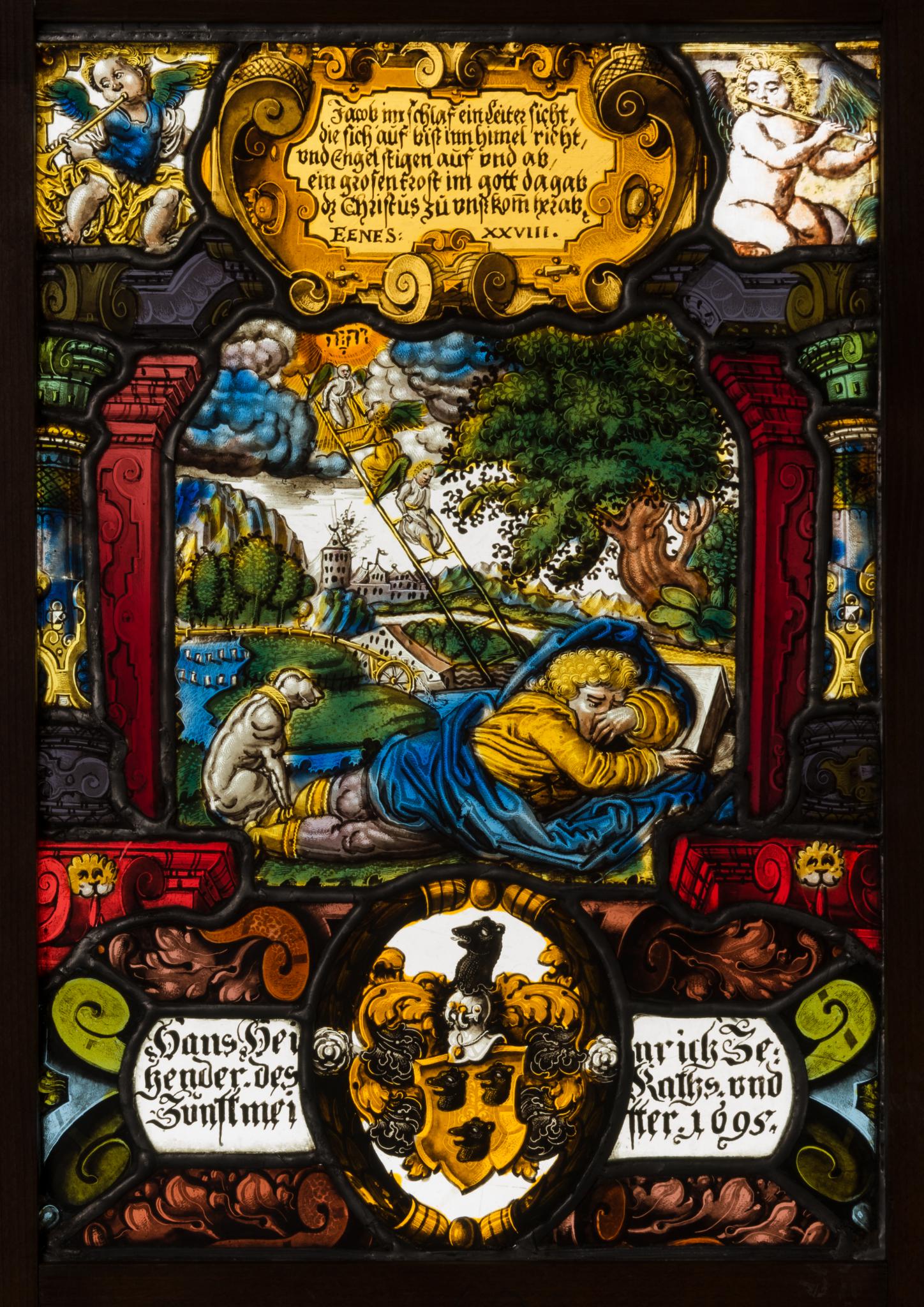 Im Hauptbild erscheint der schlafende Jakob in einer waldigen Landschaft bei seinem Traum der Himmelsleiter (Gn 28, 11–15). Darüber ist in einer von zwei musizierenden Putten flankierten gelben Rollwerkkartusche die Bildlegende angebracht. Eine Pfeilerarkade mit vorgesetzten Säulen rahmt die Darstellung. Am Fuss der Scheibe enthält eine Rollwerkkartusche mit dem zentral aufgesetzten, oval umkränzten Vollwappen Zehenders die Stifterinschrift.