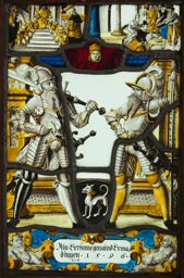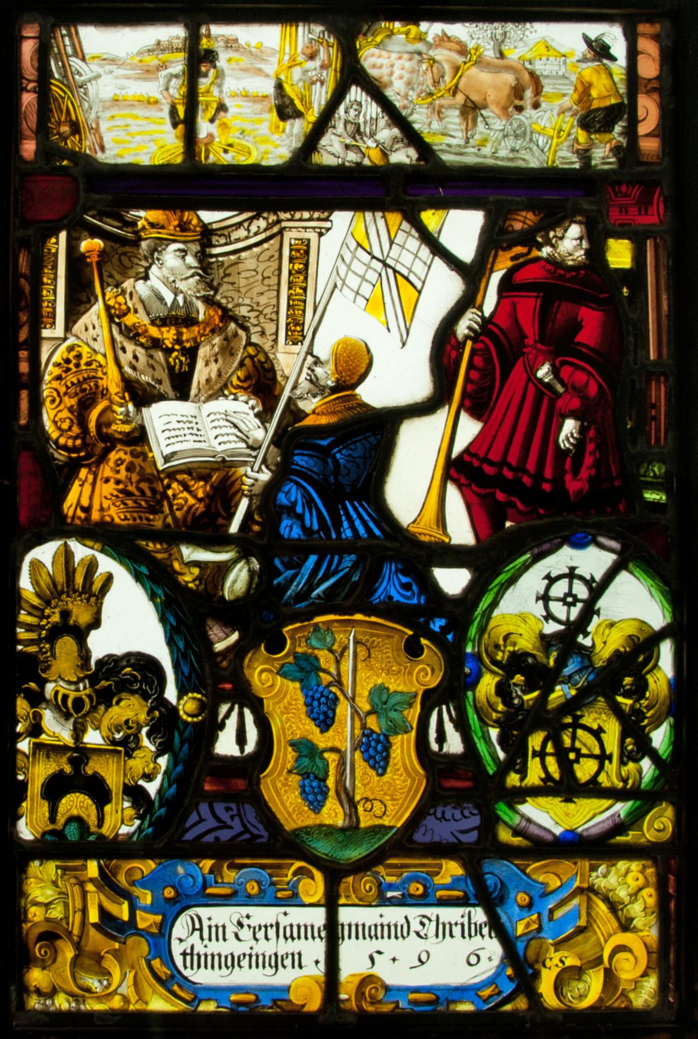 Die Scheibe enthält im Mittelteil eine nicht identifizierte Figurenszene. Sie zeigt einen thronenden Kaiser mit Zepter. Wie aus dem von ihm um den Hals getragenen Emblem des Goldenen Vlieses hervorgeht, war er ein Regent des Hauses Habsburg. Vor ihm kniet ein Mann in blauer Kleidung nieder und legt seinen Eid ab, indem er seine Rechte auf das Buch im Schosse des Herrschers legt, während er in der Linken sein Banner hält. Der dahinter stehende Posaunist in roter Tracht ist neu ergänzt. Unter den Figuren sind drei Wappenschilde angeordnet und den Scheibenfuss füllt die auf die Gemeinde Triboltingen Bezug nehmende, 1596 datierte Inschriftenkartusche. Vervollständigt wird die Komposition durch ein Oberbild, worin Bauern beim Pflügen sowie ein Wagner bei der Arbeit dargestellt sind.