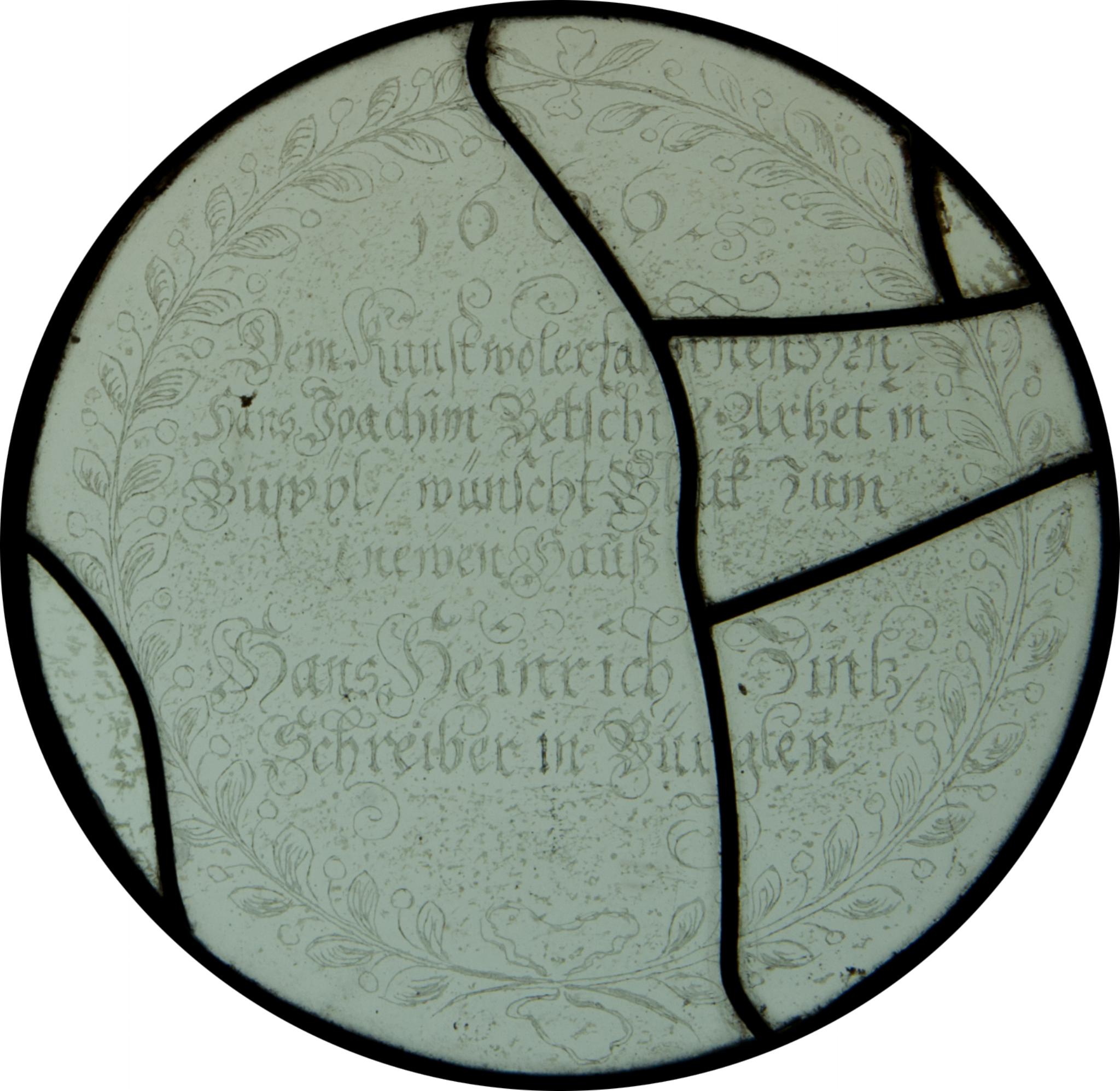 Laut Inschrift schenkte Zingg seine Scheibe dem in Buhwil wohnhaften Arzt Joachim Bötschi in sein neu erbautes Haus. 1684 war ein Joachim Bötschi in der Hintermühle in Buhwil wohnhaft, möglicherweise handelt es sich um dieselbe Person (vgl. Knoepfli, 1962, S. 360).