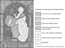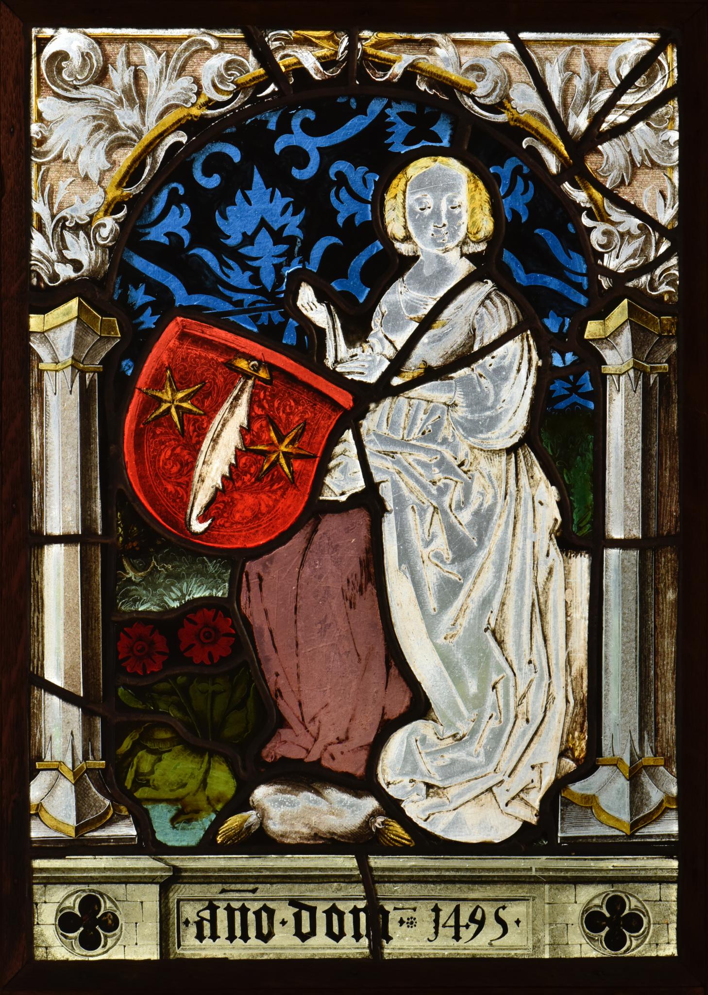 Nur die Schildhalterin und der Wappenschild sind original. Ähnliche Edeldamen als Schildhalterinnen finden sich auf zahlreichen Scheiben aus der Zeit um 1500, so etwa auf den 1495 entstandenen Scheiben des Grossmünsters Zürich (Schneider, 1971, Bd. 1, Nr. 33, 34), auf der aus der Werkstatt Lukas Zeiners stammenden Wappenscheiben Wiederkehr, Hösch, der Grafen von Sulz, von Randegg sowie Rümlang (Schneider, 1971, Bd. 1, Nr. 43, 53, 53, 65, 71), auf der Wappenscheibe Feer (vermutlich Luzerner Arbeit, Schneider, 1971, Bd. 1, Nr. 54a) sowie auf der aus Aetingen SO stammenden Wappenscheibe vom Stein (Schneider, 1971, Bd. 1, Nr. 73).