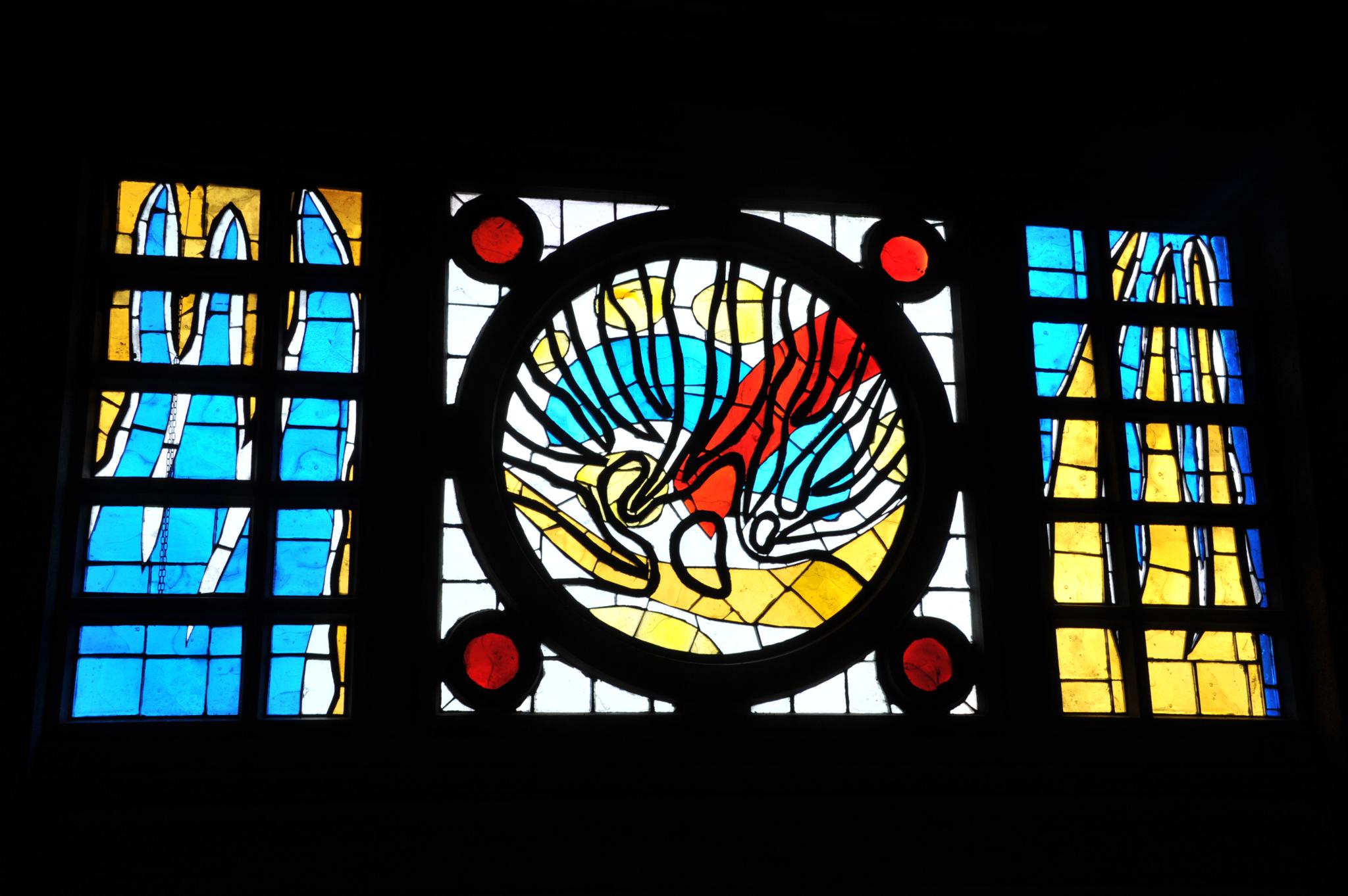 La thématique des vitraux figuratifs de l’Église Saint-Germain d’Auxerre illustre les valeurs fondamentales de l’église catholique, retranscrites dans la prière du Credo. Les thèmes se poursuivent, dans le sens horaire, dans les dix médaillons en dalle de verre dans les fenêtres de la nef principale. Le cycle commence au sud-est de l’église et suit les façades sud et nord pour se terminer au nord-est. Le thème du septième médaillon du cycle est le Saint-Esprit (NVI). Il est représenté sous la forme de la Pentecôte : « Je croie en l’Esprit-Saint ». La Pentecôte célèbre le septième dimanche après Pâques lorsque le Saint-Esprit descend sur les apôtres. Cet événement est symbolisé par des flammes posées sur la tête des douze apôtres. Dans ce vitrail, Fernand Léger ne garde que la substance principale du symbole, la flamme. Douze flammes occupent donc tout l’espace du vitrail, agrémenté de formes rouge, jaune et bleu.