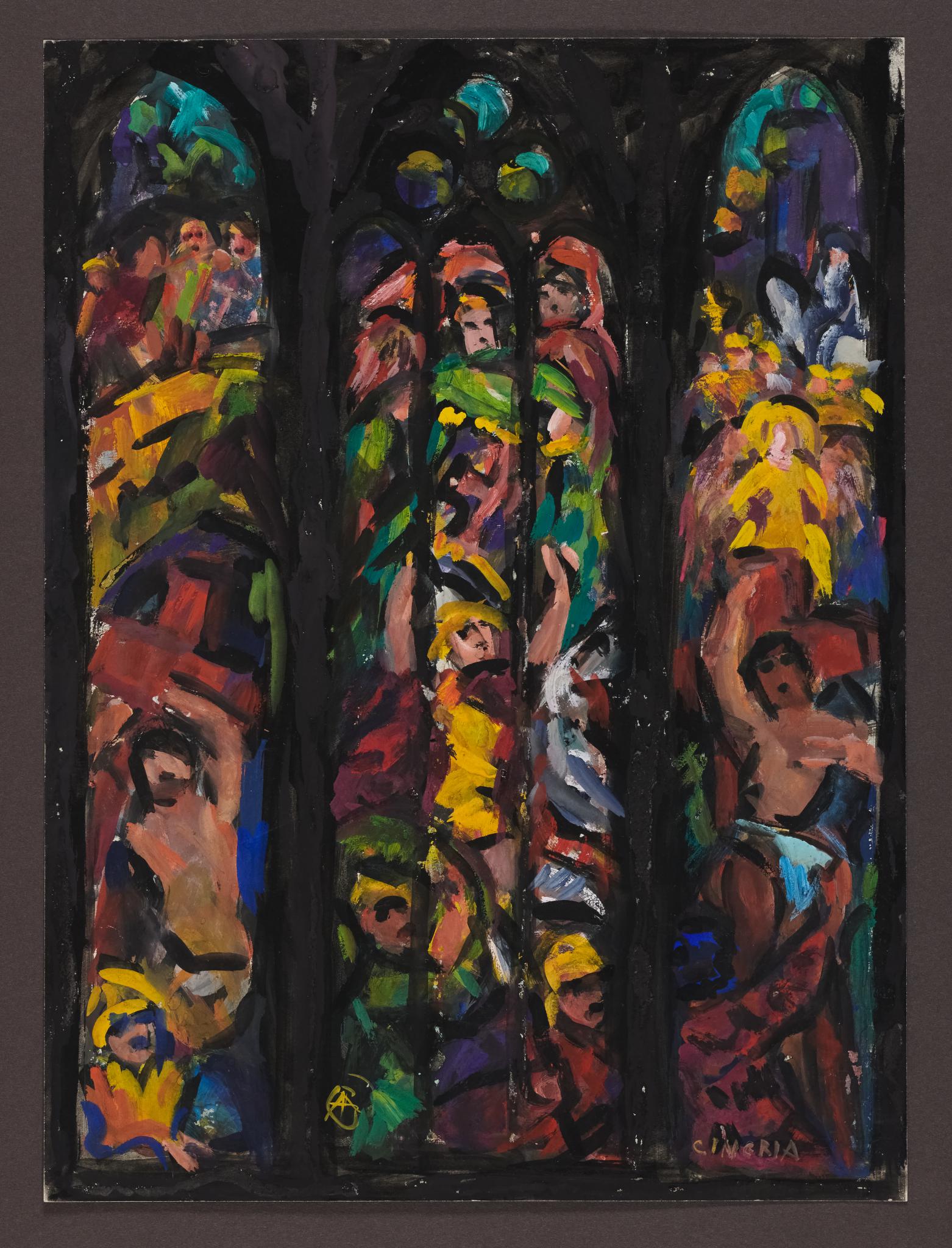 Étude préparatoire colorée d’Alexandre Cingria pour les trois fenêtres du chœur de l’église du Couvent des Cordeliers à Fribourg. Le projet illustre deux moments de la légende de la Croix (fenêtres latérales) et la Résurrection (fenêtre centrale).