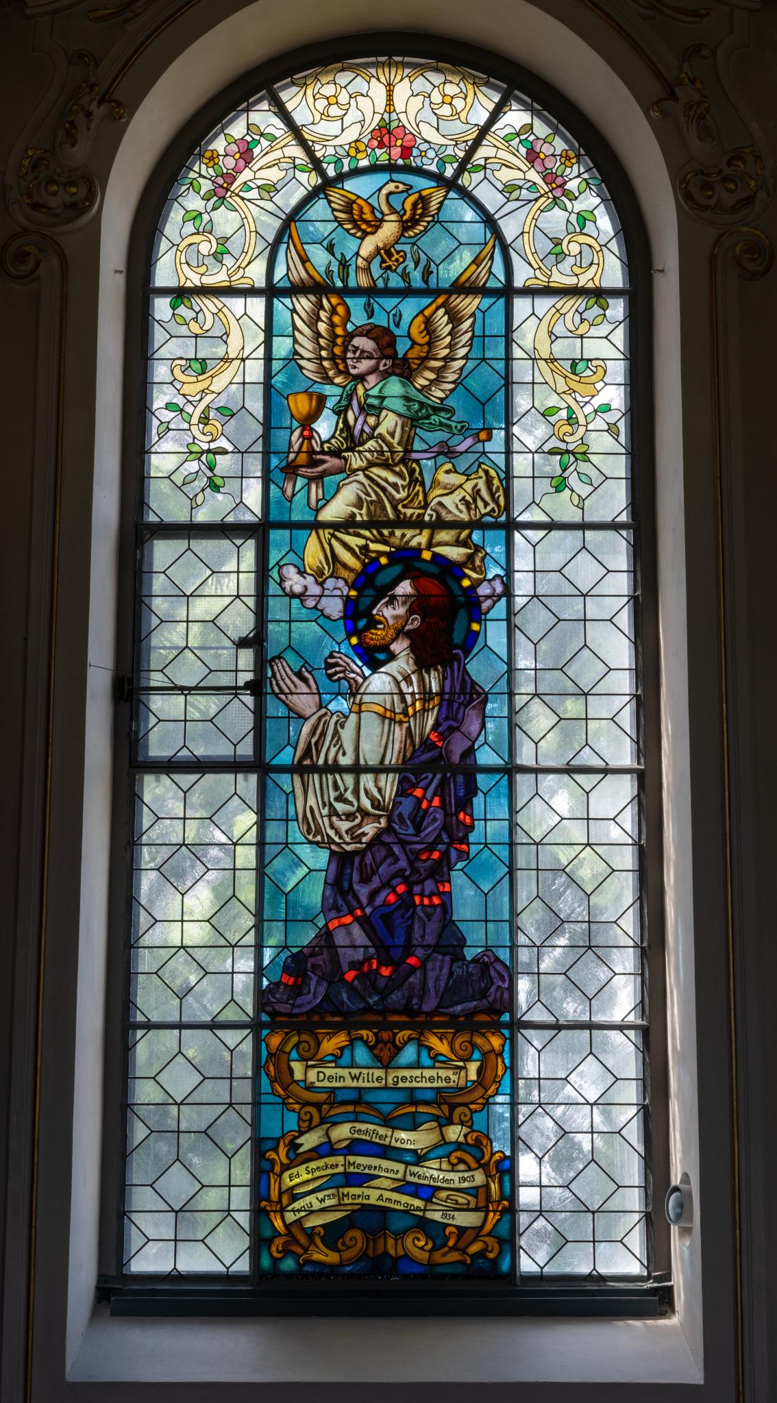 Jakob Georg Röttingers vorgeschlagene “Muster” gefielen am Besten. Die Verwendung von Opalgläsern erzielte bei seiner Offerte eine Preisreduktion (was bei anderen einen Aufschlag bedeutete). Daher erhielt der Glasmaler den Zuschlag und führte die zwölf Rundbogenfenster sowie sieben Okuli mit Blumengirlanden und einer Kartusche am Scheibenfuss aus.