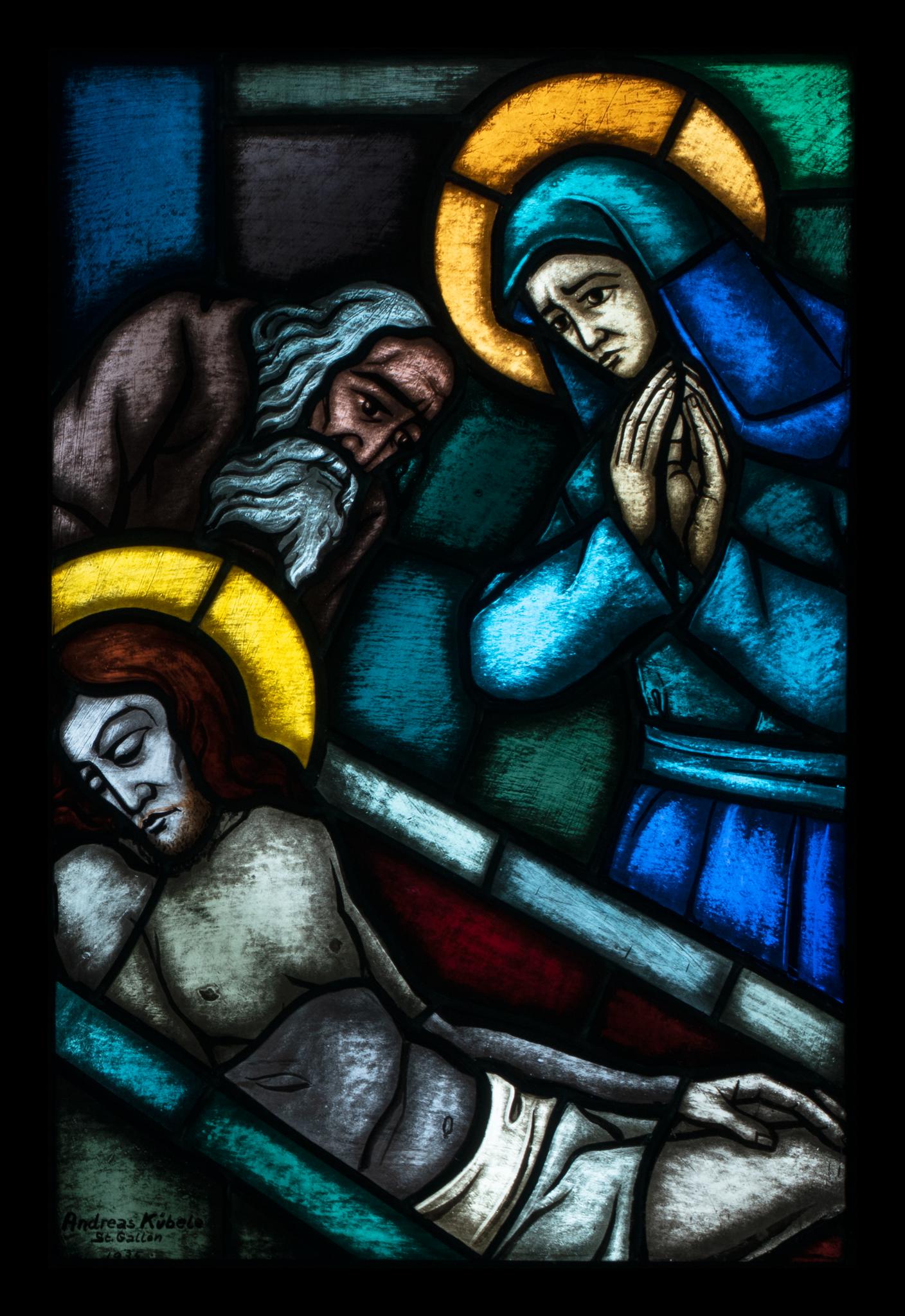 In vierzehn schmalen, in farbige Rechtecke gegliederten Rundbogenfenstern ist ein Kreuzwegzyklus dargestellt. Die Intensität der Farben nimmt nach unten zu. Josef von Arimathäa legt Christus in sein Grab, Maria steht mit gefalteten Händen daneben.