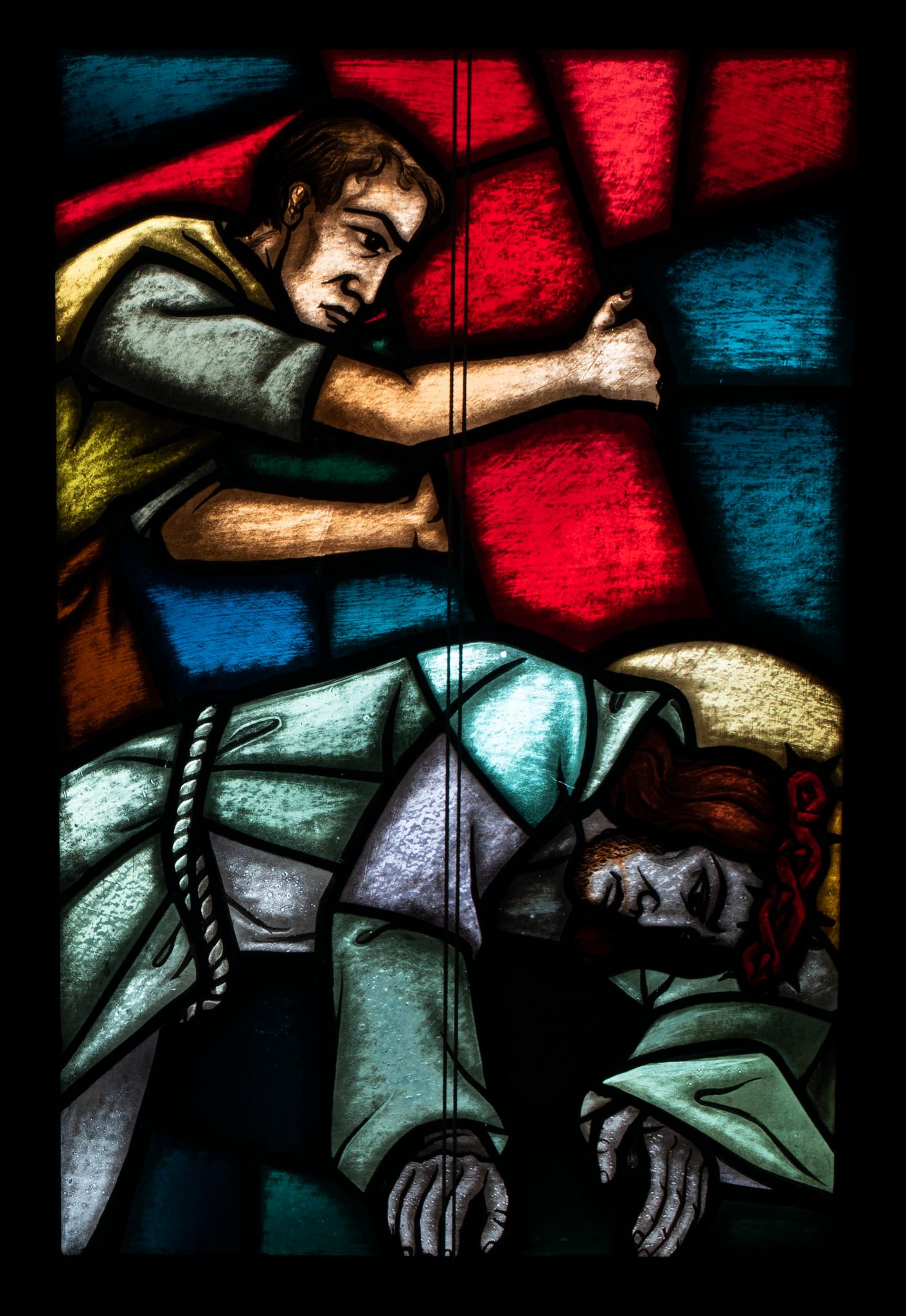 In vierzehn schmalen, in farbige Rechtecke gegliederten Rundbogenfenstern ist ein Kreuzwegzyklus dargestellt. Die Intensität der Farben nimmt nach unten zu. Hier fällt Christus zum dritten Mal.