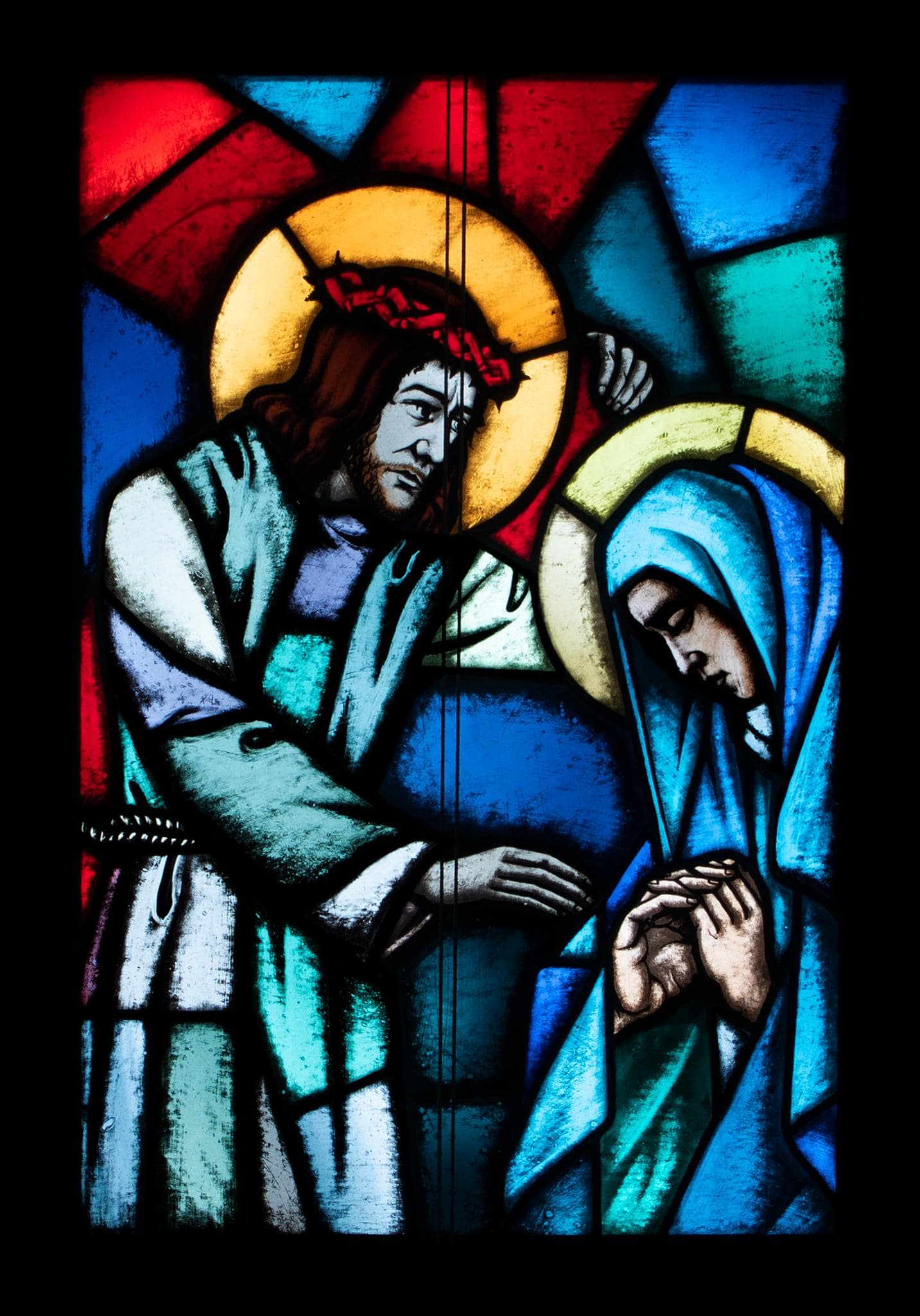 In vierzehn schmalen, in farbige Rechtecke gegliederten Rundbogenfenstern ist ein Kreuzwegzyklus dargestellt. Die Intensität der Farben nimmt nach unten zu. Christus begegnet seiner Mutter.