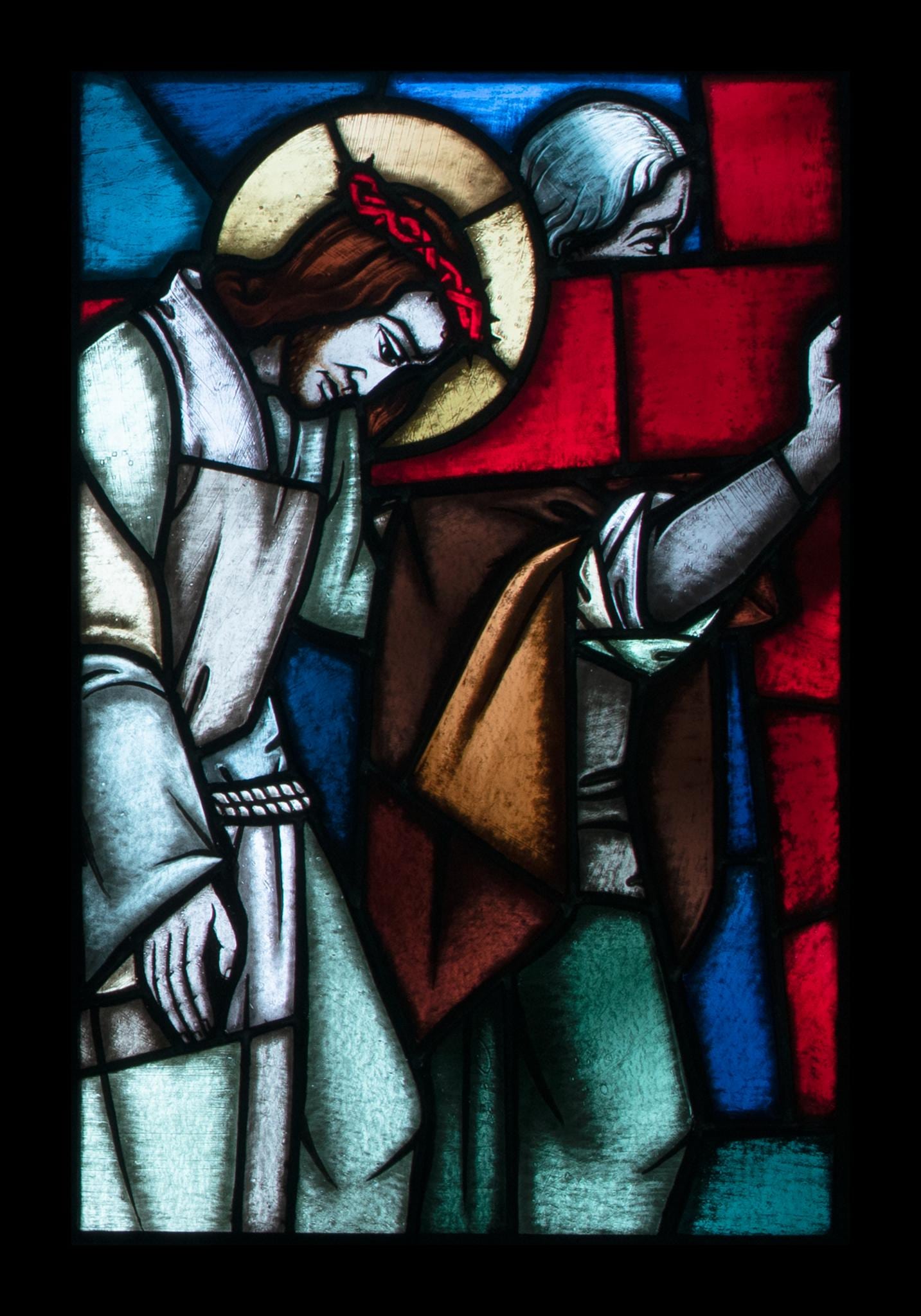 In vierzehn schmalen, in farbige Rechtecke gegliederten Rundbogenfenstern ist ein Kreuzwegzyklus dargestellt. Die Intensität der Farben nimmt nach unten zu. Simon von Kyrene hilft, das Kreuz zu tragen.