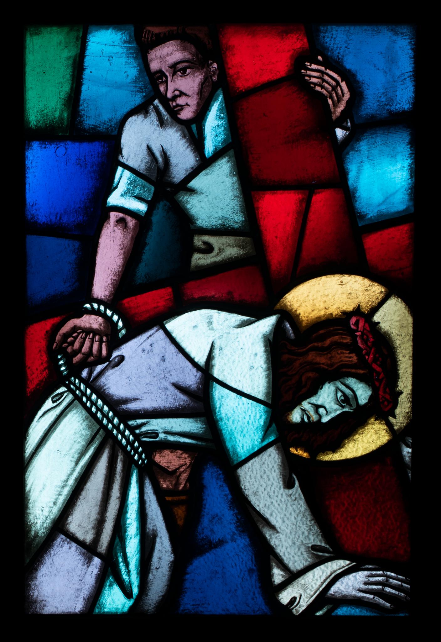 In vierzehn schmalen, in farbige Rechtecke gegliederten Rundbogenfenstern ist ein Kreuzwegzyklus dargestellt. Die Intensität der Farben nimmt nach unten zu. Christus fällt zum zweiten Mal.