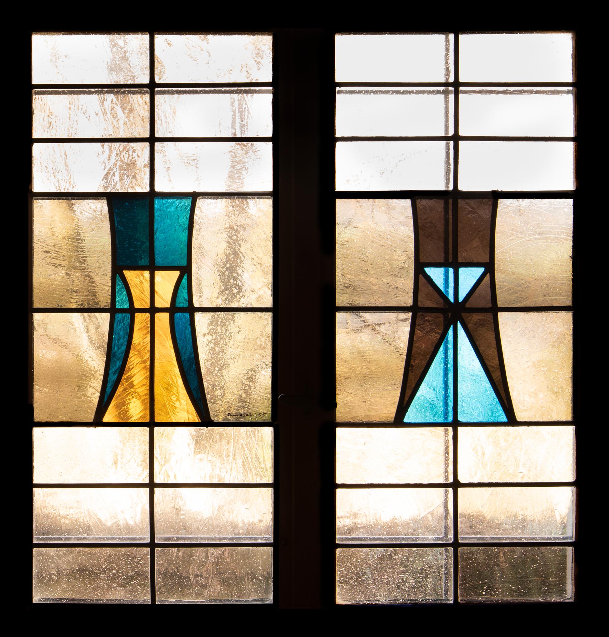 Zweiflügeliges bleiverglastes Fenster mit farbigen Einlagen: Lob- und Sühneopfer.