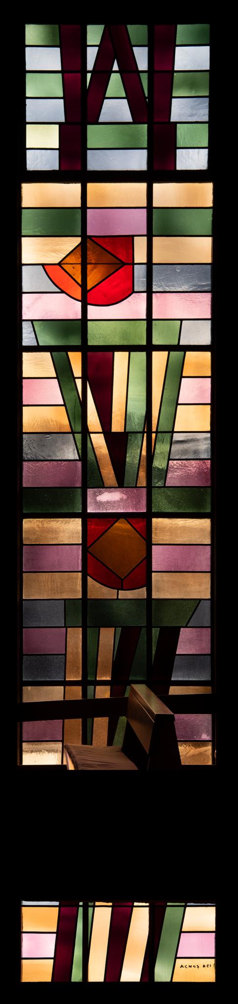 Das hochrechteckige Fenster zeigt farbige Rechtecke und christliche Symbole.