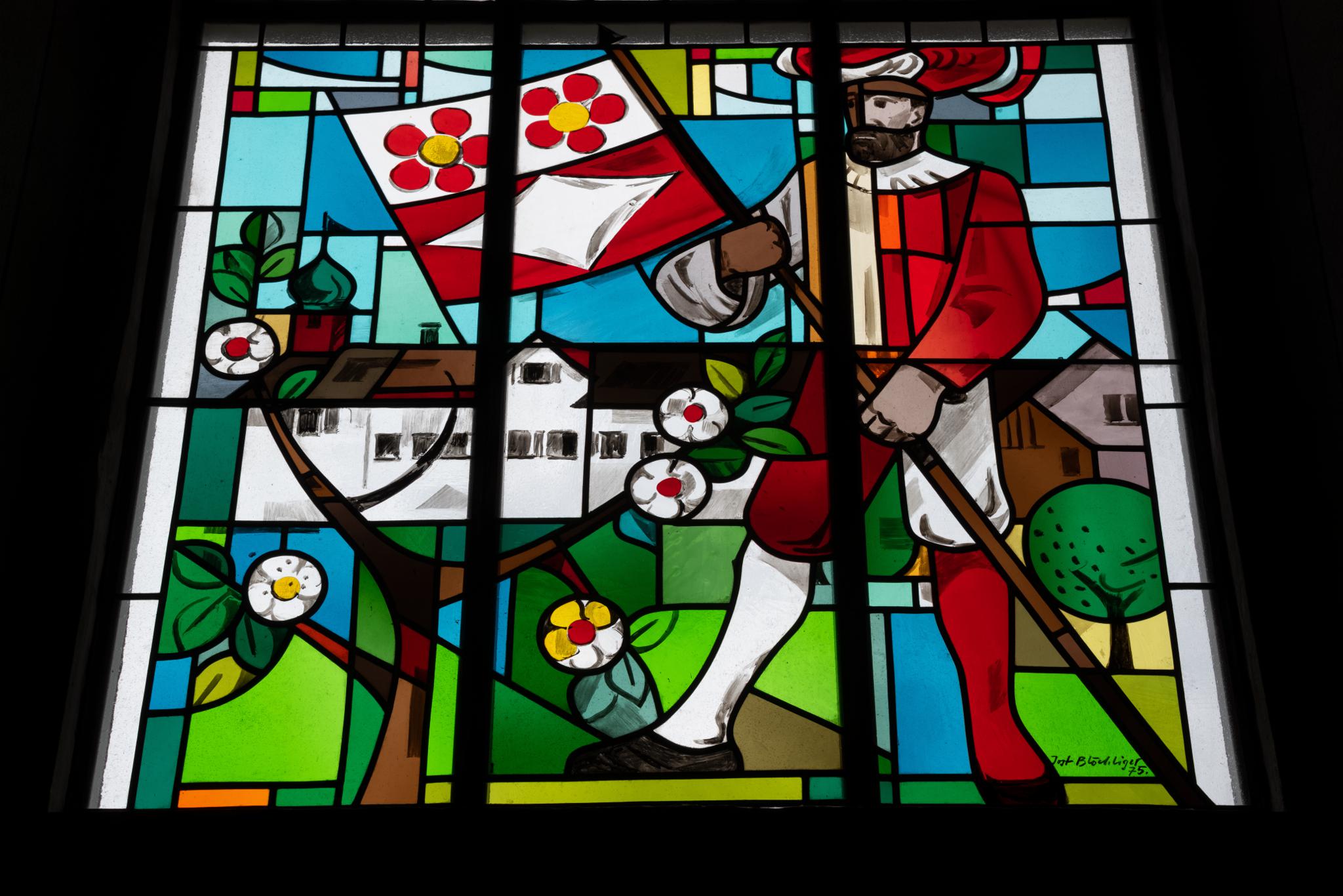 Ein Bannerträger mit dem Banner Bettwiesens steht vor dem dortigen Schloss. Im Vordergrund blüht ein Obstbaum.