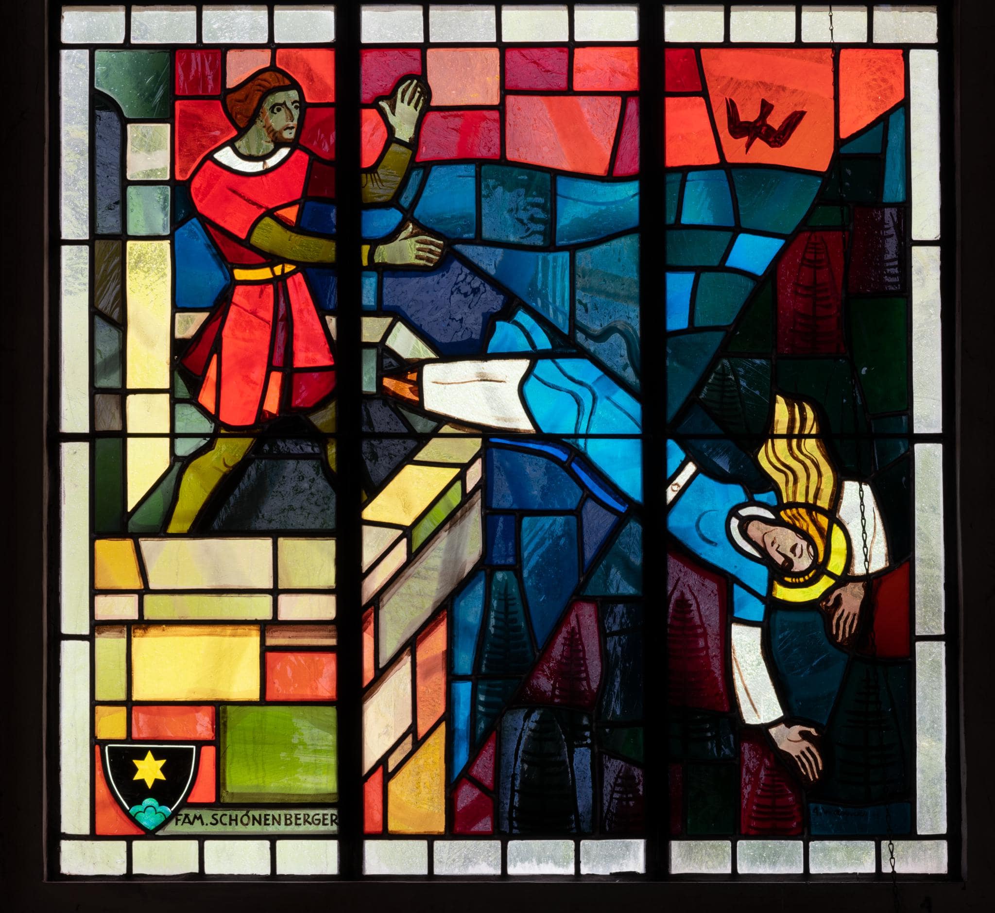 Heinrich von Toggenburg stiess Idda 1191 von seiner Burg – der heutigen St. Iddaburg – in den Abgrund. Im Hintergrund fliegt der Rabe, der Iddas Ring stahl. Unten links ist das Stifterwappen angebracht.