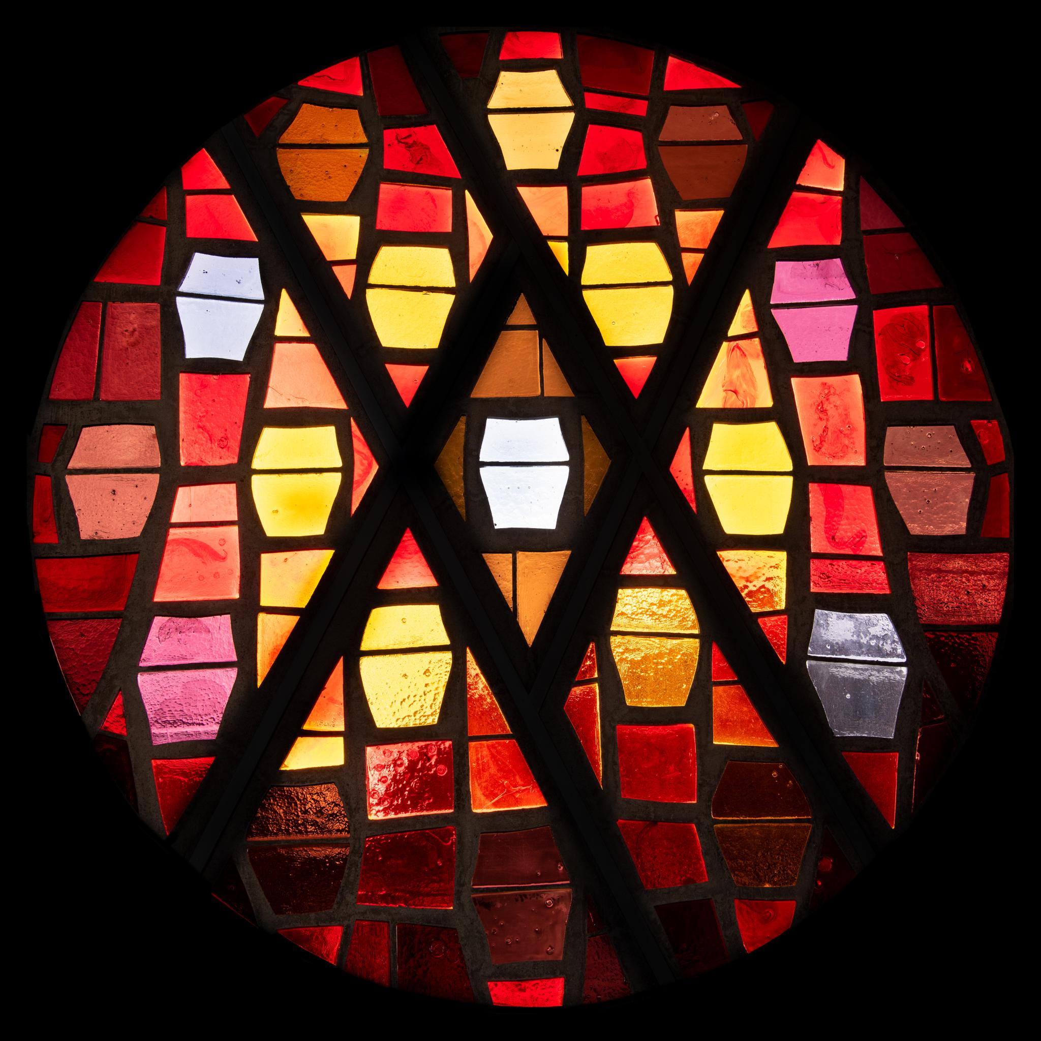 In rot-gelben Farbtönen gestaltetes Rundfenster. Die Mitte ist durch breite, diagonal geführte Eisenträger und einem hellen Sechseck hervorgehoben.