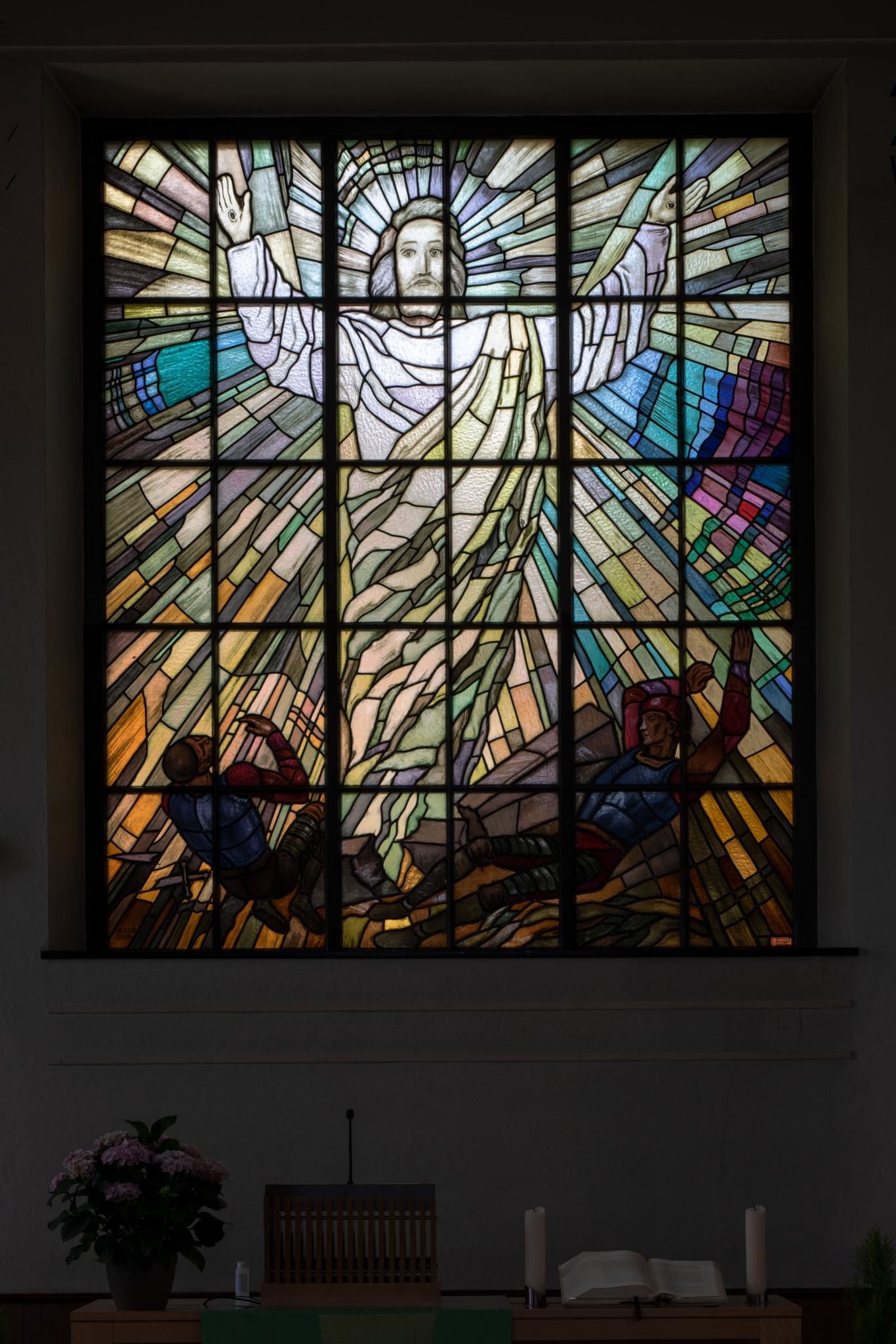 In einem Strahlenkranz erscheint der auferstandene Christus, unter ihm die zerbrochene Grabplatte sowie die schlafenden Grabwächter.