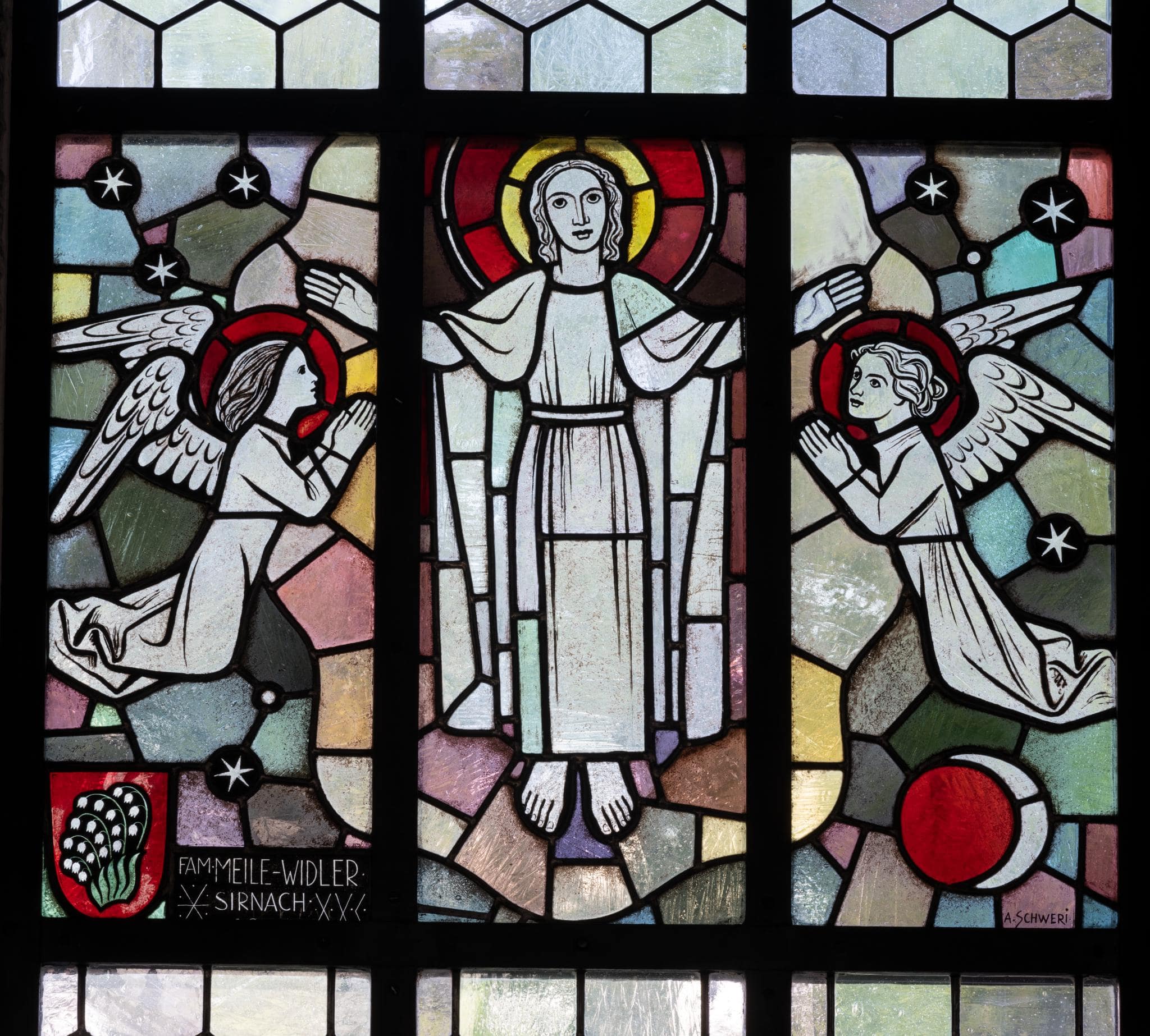 Von zwei Engeln begleitet schwebt Maria in den Himmel. Rechts unten ist eine Mondsichel als Mariensymbol dargestellt, links das Stifterwappen.