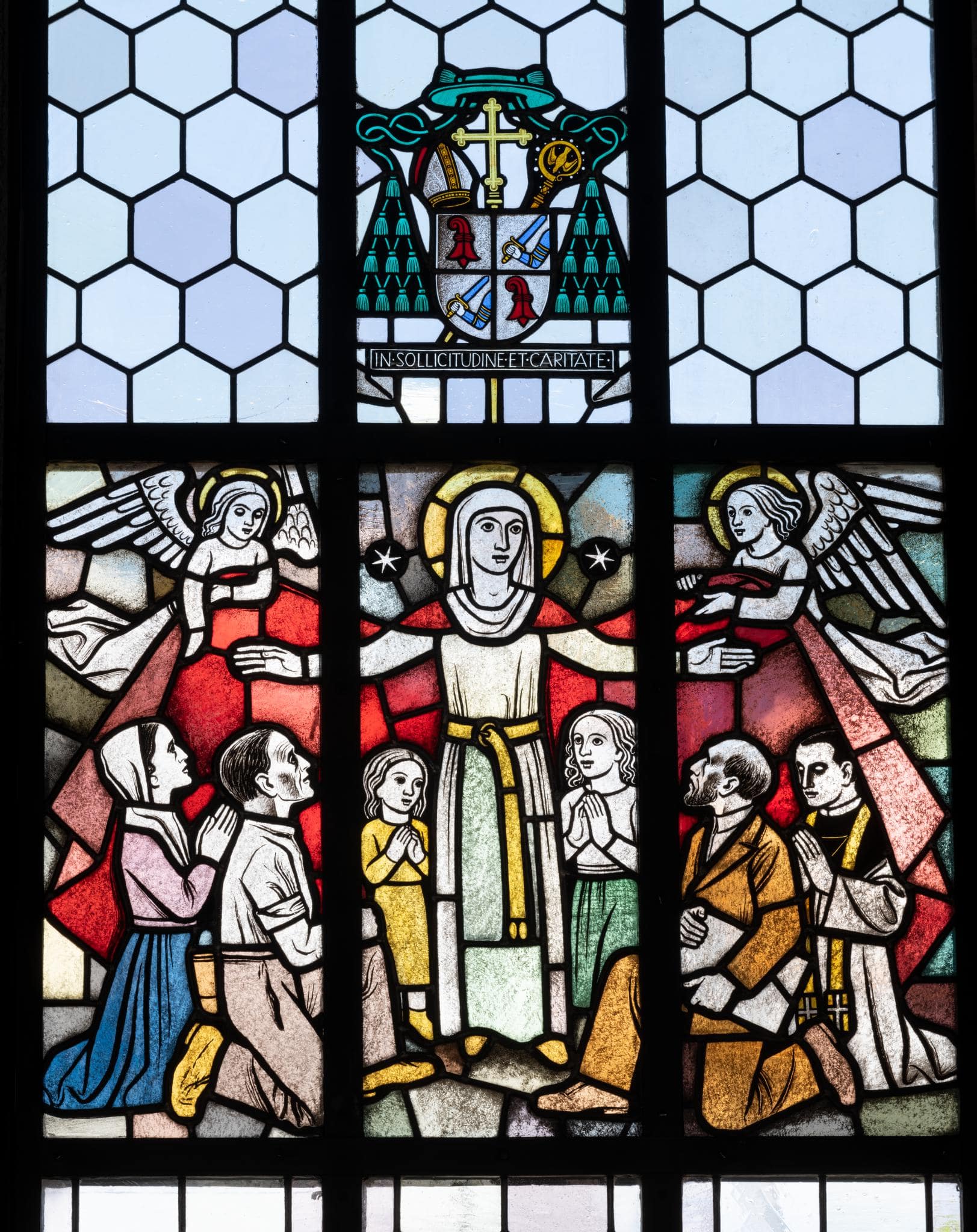 Maria birgt die Gläubigen unter ihrem ausgebreiteten Mantel. Zwei Engel halten den Mantel. Über der Szene ist das Wappen des Bischofs Franz von Streng angebracht.