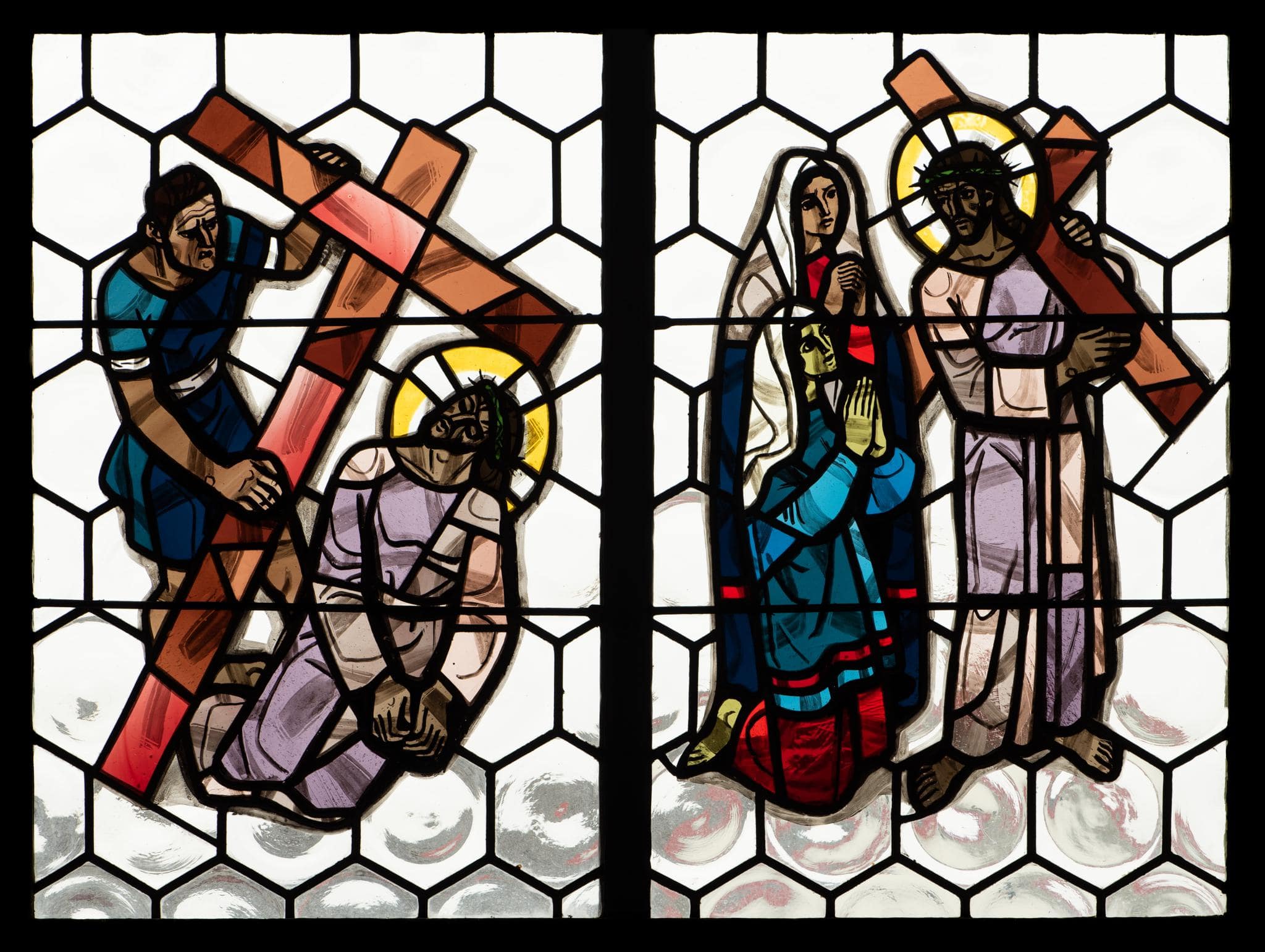 In acht Rundbogenfenster mit Bienenwaben-Blankverglasung wird ein Kreuzweg dargestellt. Im Fenster s VIII ist rechts zu sehen, wie Jesus die weinenden Frauen trifft, links fällt er zum dritten Mal unter dem Kreuz.