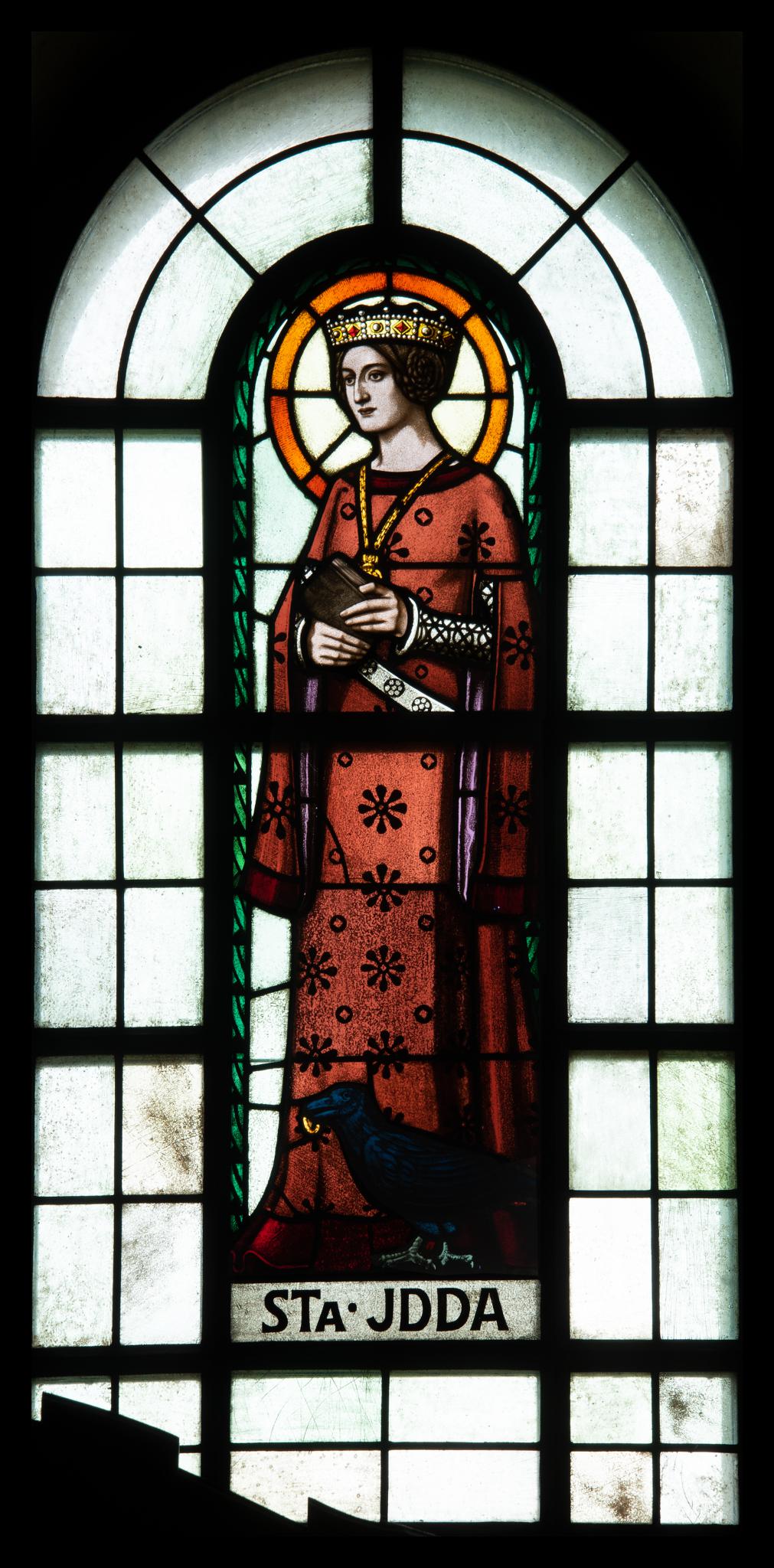 Mit opaken Rechtecken blank verglastes Rundbogenfenster mit der Darstellung der Ganzfigur der heiligen Idda von Toggenburg in den beiden zentralen Feldern. Die Heilige trägt eine Krone und ein reich geschmücktes Gewand, und ist mit einem Buch in der Hand gezeigt. Vor ihr am Boden sitzt der Rabe mit dem goldenen Ring im Schnabel. Unterhalb der Figur Namenszug.