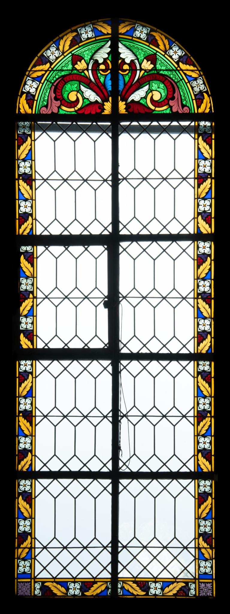 Rundbogenfenster mit Schweizerrauten in Blankverglasung; bunte Randverzierung mit Blumen und Blättern sowie Bogenfeld mit pflanzlichen Ornamenten, in den Farben Gelb, Grün und Rot.