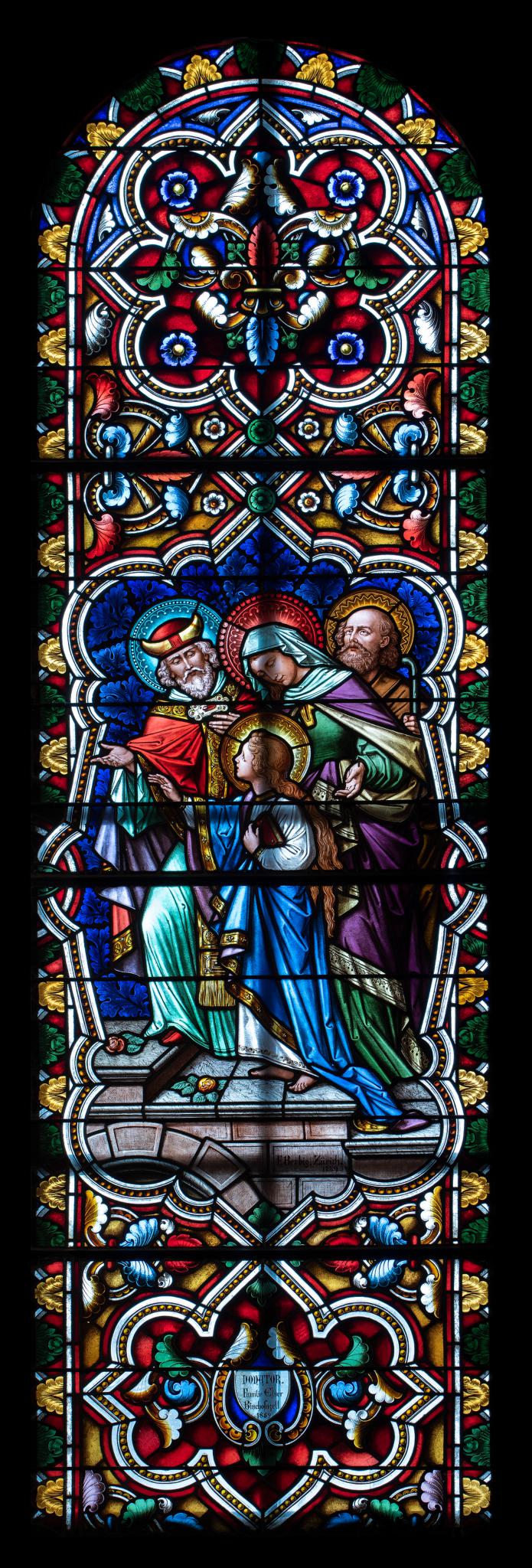 Für die Erstellung der Glasmalereien der 1888 neu erbauten katholischen Pfarr-und Wallfahrtskirche St. Pelagiberg wurden die beiden Firmen Berbig und Wehrli in Zürich zu einer Konkurrenz eingeladen. Die Kirchenvorsteherschaft beabsichtigte, zwei Chorfenster mit den Darstellungen von Mariae Heimsuchung und Mariae Tempelgang sowie ein dekoratives Rosettenfenster in der Westfassade anbringen zu lassen, die übrigen Fenster in Chor und Schiff sollten eine helle Verglasung mit farbiger Bordüre und Verzierung im Bogenfeld erhalten (StATG, KKG 38, B 13.3.5/1; Sitzungsprotokolle der Kirchvorsteherschaft vom 10.10.1888 und 23.10.1888). Der Auftrag wurde schliesslich an Friedrich Berbig vergeben, der durchsetzte, die figürlichen Szenen der Chorfenster nicht in architektonische, sondern in ornamentale Rahmungen einzubinden, womit er dem Gestaltungsprinzip mittelalterlicher Medaillonfenster folgte (StATG, KKG 38, B 13.3.5/1; Sitzungsprotokoll der Kirchvorsteherschaft vom 31.3.1889). Beim Entwurf der Kartons für die Chorfenster kam es zu einem Missverständnis betreffend der gewünschten Motive, zudem zeigten mehrere der schliesslich eingesetzten Fenster bald Sprünge und Risse, die Berbig vor Auszahlung des gesamten Rechnungsbetrages zu reparieren hatte (StATG, KKG 38, B 13.3.5/1; Sitzungsprotokolle der Kirchvorsteherschaft vom 23.5.1889, 5.9.1889 und 10.11.1889). Heute sind noch Berbigs Chorfenster erhalten (TG_703, TG_704), die übrigen Fenster wurden Mitte des 20. Jahrhunderts ausgewechselt (s. TG_707).