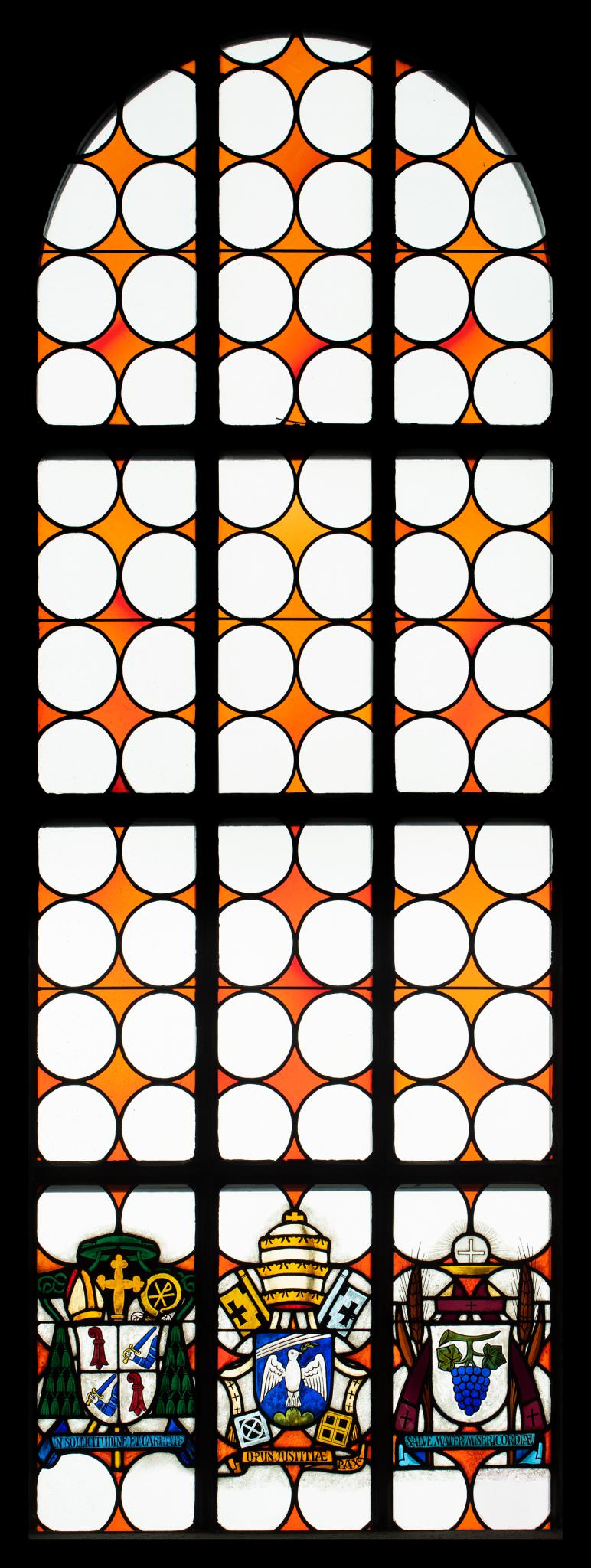Im untersten Register drei klerikale Wappen mit Inschrift. Die Fensterfläche wurde mit farblosen Kreisen und roten Zwischenräumen gestaltet.