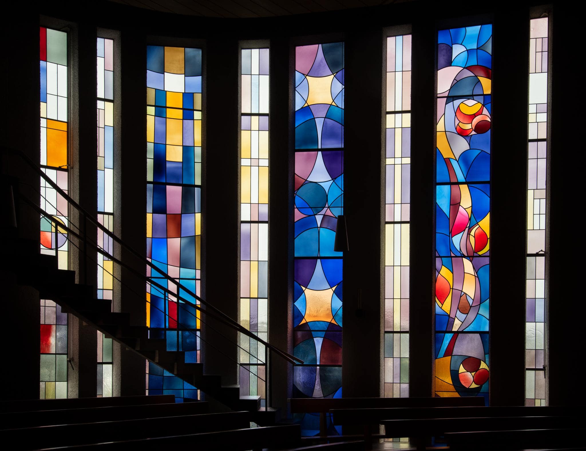 Achtteilige Fensterwand. Fünf schmalere Fenster sind in hellen Rechtecken gestaltet, drei breitere Fenster in abstrakten Formen mit dominierenden Blautönen.