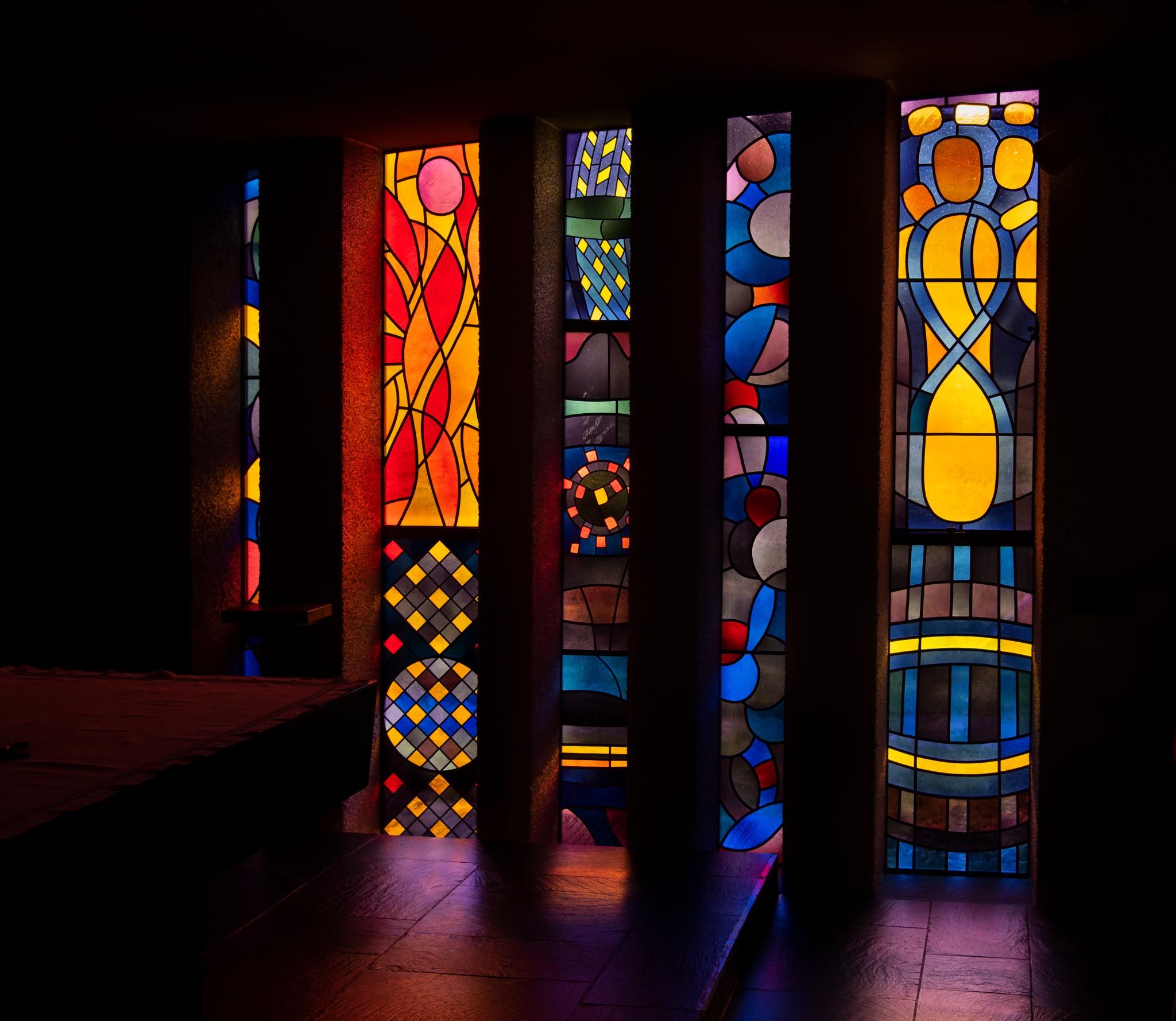 Fünfteilige Fensterwand mit hochrechteckigen Scheiben von verschieden breiten Mauerteilen getrennt. Abstrakte Glasmalerei.