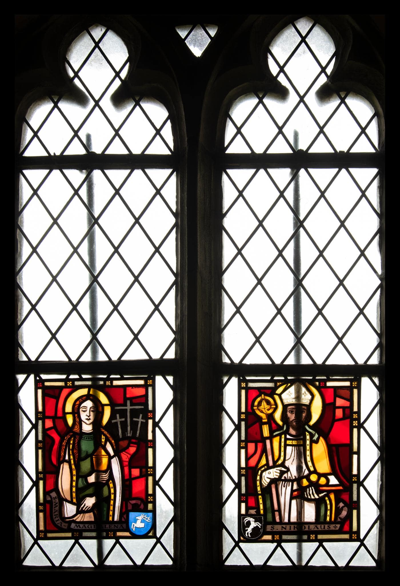 Doppellanzettiges Masswerkfenster mit blanker Rautenverglasung. Rechts Halbfigur der Maria Magdalena mit Kelch in der rechten Hand, links Halbfigur des heiligen Nikolaus mit Bischofsstab und drei goldenen Kugeln.