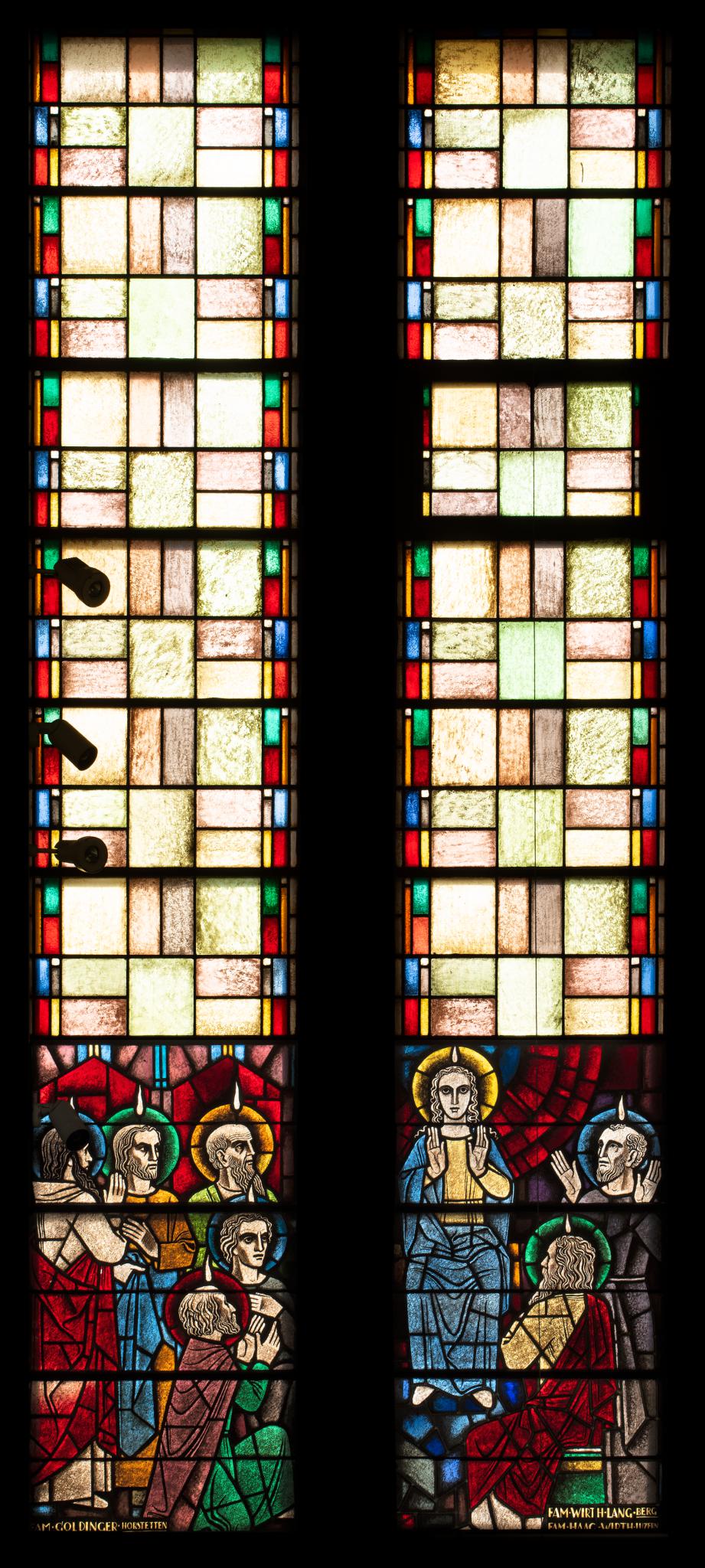 Hochrechteckige, schmale Fenster mit farbigen Rechtecken und Rahmenverzierung. Im unteren Drittel Darstellung der Aussendung des heiligen Geistes an Pfingsten. Maria ist umgeben von den Aposteln, über deren Köpfen ein Flämmchen als Zeichen des heiligen Geistes schwebt.