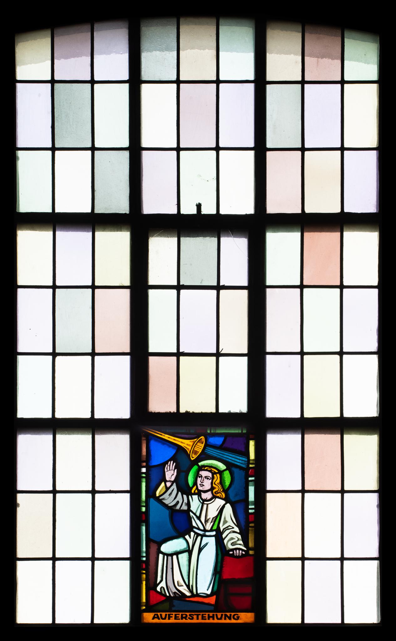 In zwölf Fenstern sind Sinnbilder des Apostolischen Glaubensbekenntnisses dargestellt. Hier ist die Auferstehung der Toten, wie in der Inschrift und im Credo genannt, sowie die Posaune Gottes (1 Kor 15,52) zu sehen.