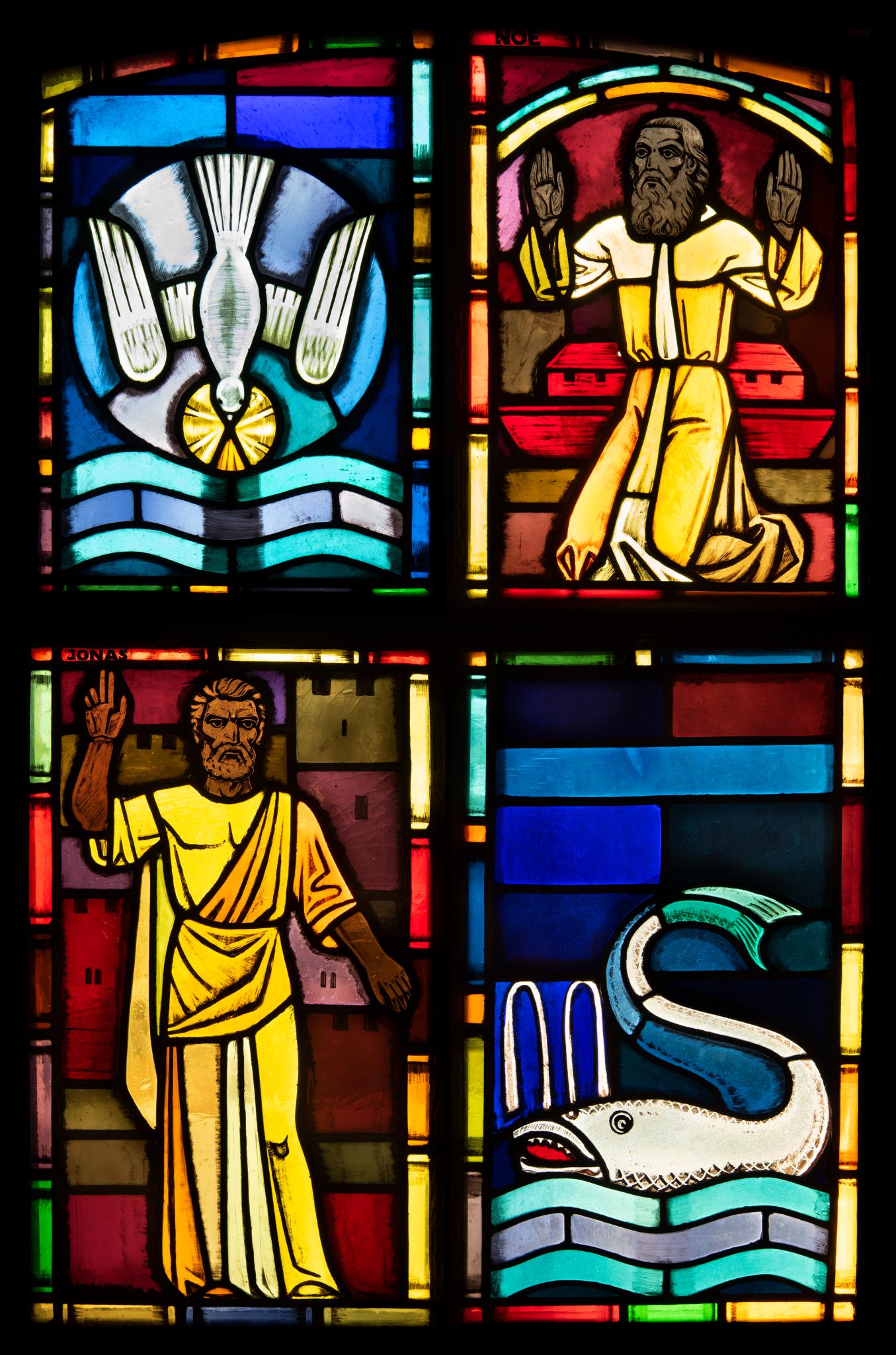 Die zwei vierteiligen Glasgemälde in der Westwand thematisieren Christus und seine Auferstehung. Hier sind der Heilige Geist als Taube, Noah mit der Arche sowie Jonas und der Wal dargestellt. Die alttestamentarischen Geschichten von Noah und Jonas gelten als Präfigurationen der Auferstehung Christi (1 Petr 3,20; Matthäus 12,40).