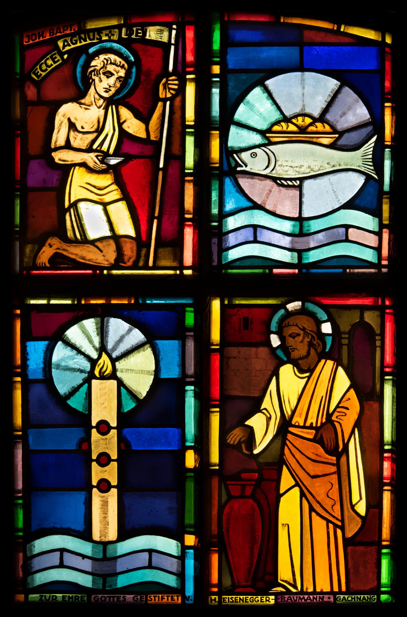 Die zwei vierteiligen Glasgemälde in der Westwand thematisieren Christus und seine Auferstehung. Oben links kniet Johannes der Täufer und bezeichnet den unten rechts stehenden Christus als Lamm Gottes. Neben ihm sind Fisch und Brot als Christussymbole, links unten eine Osterkerze dargestellt.
